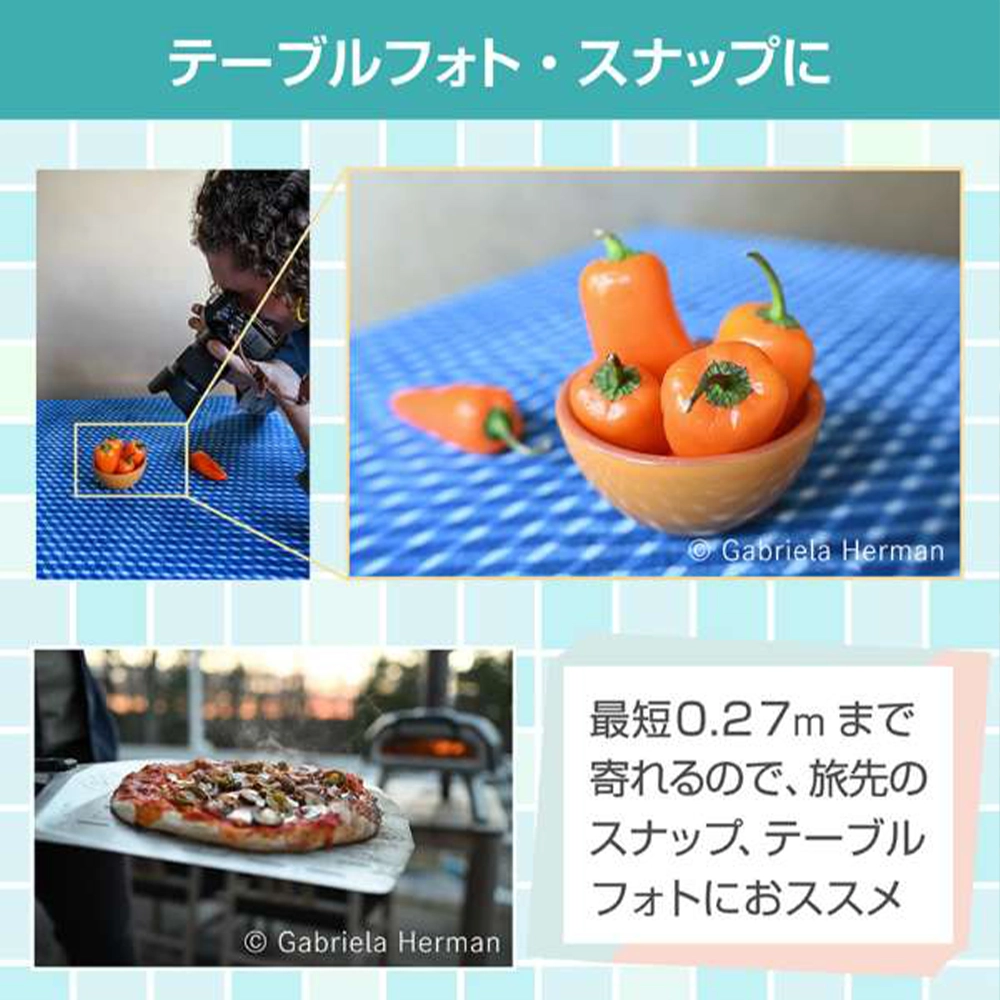 最短撮影距離は0.27m。被写体にぐっと近づいてもピントが合います。カフェでイスに座ったまま、テーブルの上の被写体を大きな背景ボケを活かして、印象的に撮影することもできます。