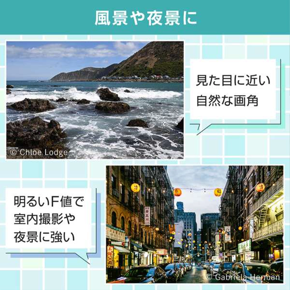 広角35mmの画角により見たままの自然な範囲を収めることができ、ポートレートからクローズアップまでこのレンズ1本で撮影が可能です。また、さまざまなアングルからの撮影にも適しており、広大な風景やストリートスナップ、花やペット、日常生活など、多彩なシーンで奥行き感を活かして印象的に撮影できます。