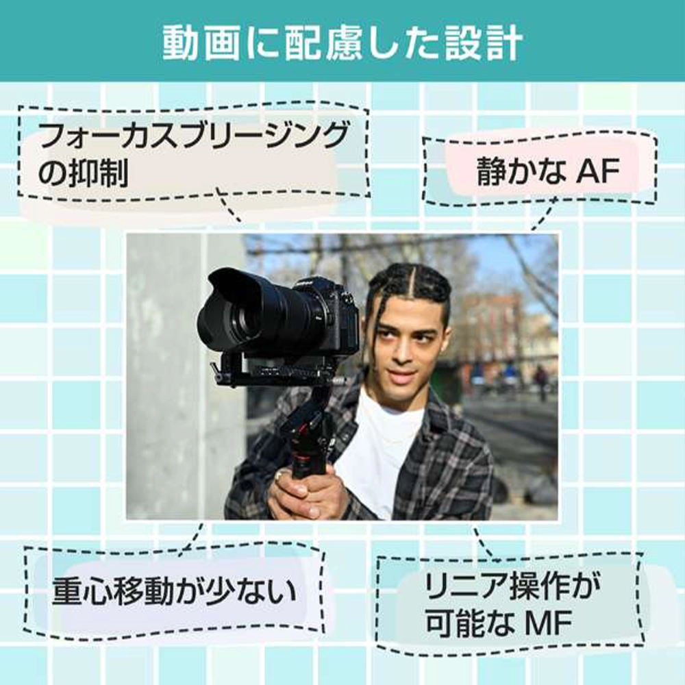 フォーカスブリージングを効果的に抑制しているため、ピント位置を変更しても自然な映像が得られます。さらに、STM(ステッピングモーター)による静粛なAFを実現。静かな場所での動画撮影時も、レンズの駆動音や操作ノイズが記録されにくくなります。ジンバル装着時の撮影でも、フォーカス時の重心移動が少なく、バランスを保ちやすいことも特長です。