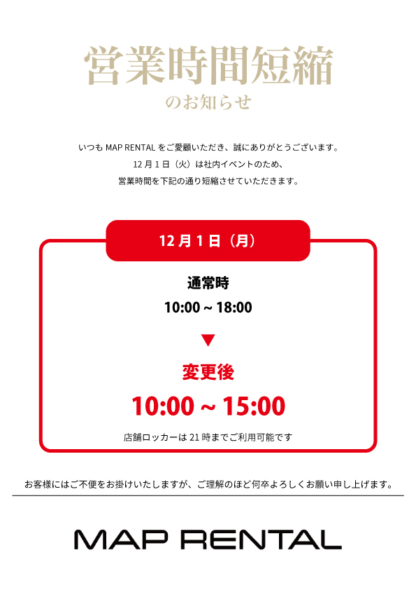 2025.11.19 12月1日 営業時間短縮のお知らせ 【12月1日営業時間について】 ・店舗 10:00-15:00まで ・ロッカー 6:30-21:00まで ・WEBオーダー 15:00-18:00は当日受け取り(店舗カウンターまたはロッカーでの受け取り)のご注文はできません