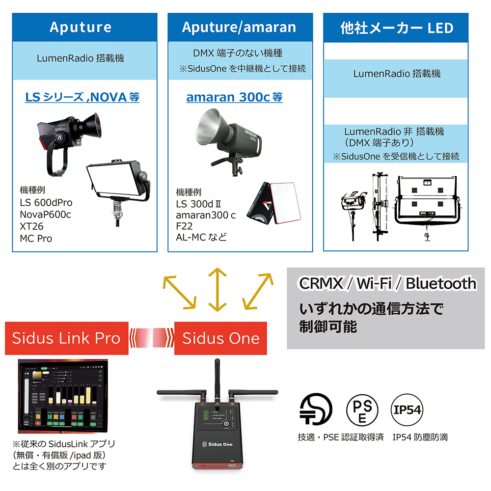 - CRMX,DMX512,RDM,Art-Net(Wi-Fi接続)Sidus Link BT