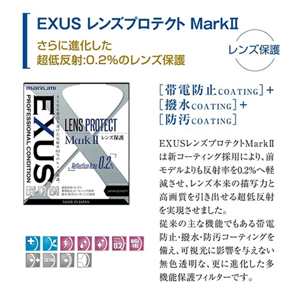 マルミのレンズ保護フィルターの最高峰に位置する「EXUS Lens Protect SOLID」と同等の「超低反射コーティング[反射率:0.2%]」・「帯電防止コーティング」・「撥水コーティング」・「防汚コーティング」を備え、レンズ本来の描写力を最大限に活かし、可視光に影響を与えない無色透明な高性能レンズ保護フィルターです。