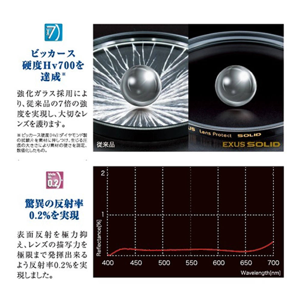 EXUS Lens Protect SOLIDは、マルミのレンズ保護フィルターの最高峰に位置し、 大口径レンズを使用するカメラ上級者のための保護フィルターです。通常のマルミの保護フィルターの約7倍の強度※を有し、登山やトレイルなど、厳しい環境で強い衝撃からカメラレンズを守ります。