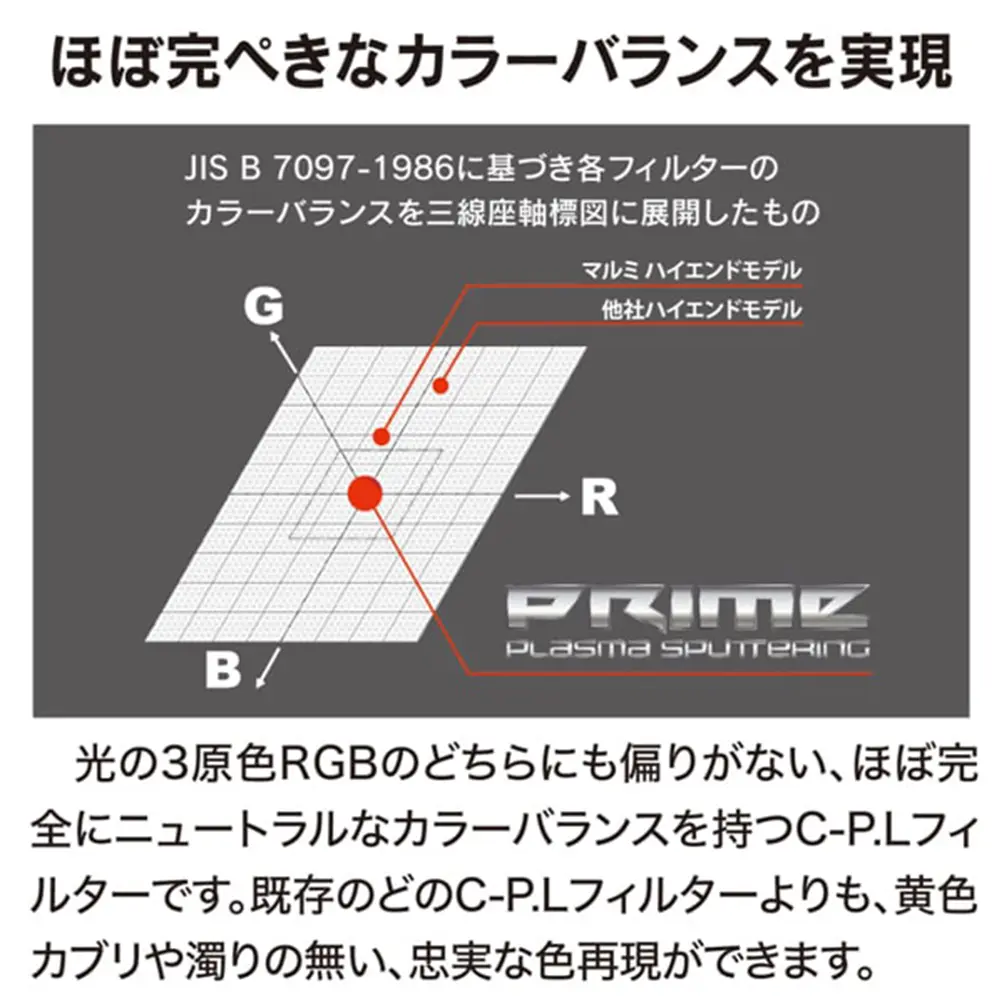 光の3原色RGBのどちらにも偏りがない、ほぼ完全にニュートラルなカラーバランスを持つC-P.Lフィルターです。厳選した偏光膜と、プラズマ・スパッタリングならではのフラットな反射率特性によって、既存のどのC-P.Lフィルターよりも、黄色カブリや濁りの無い、忠実な色再現ができます。