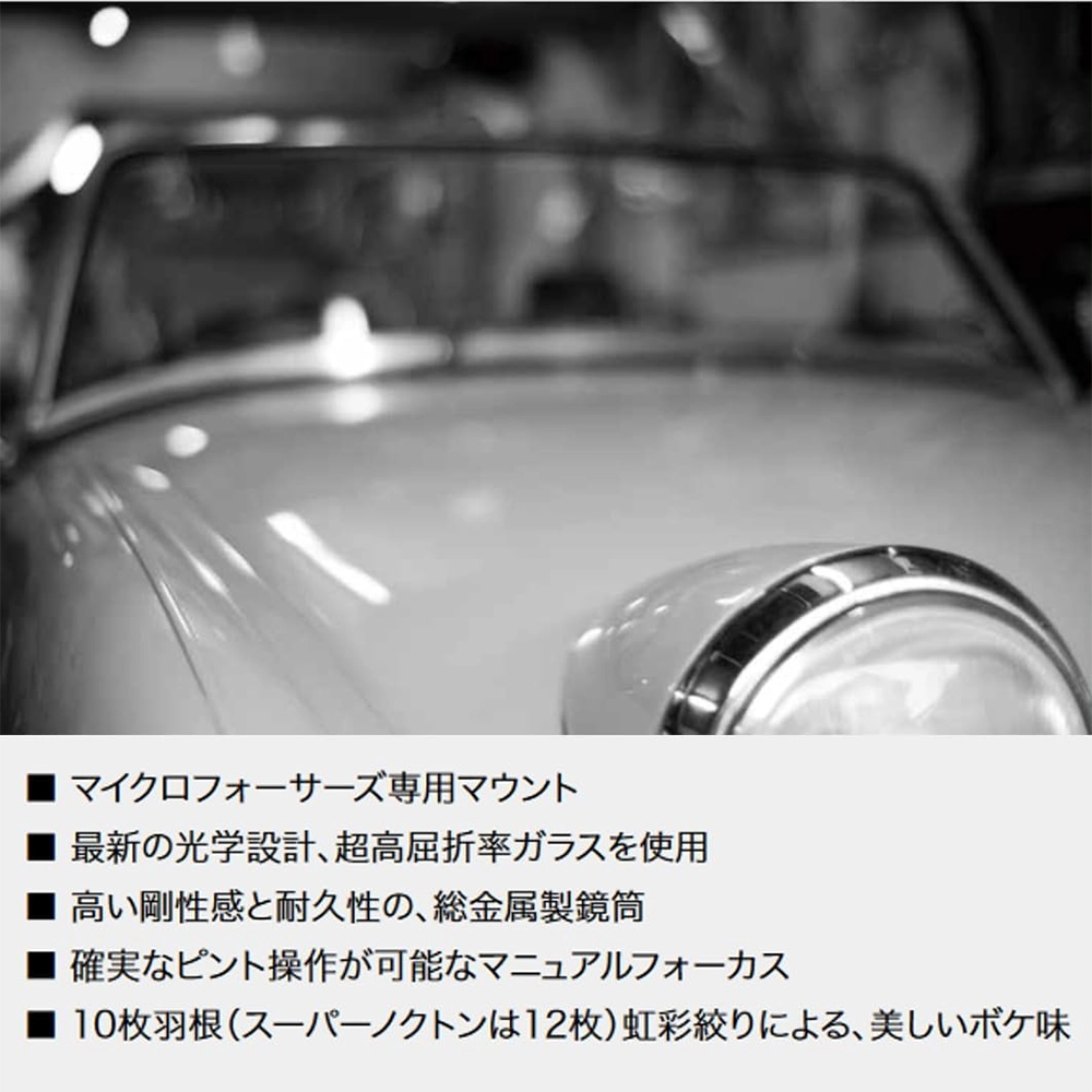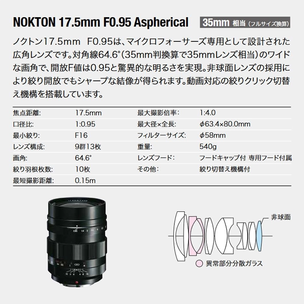 ノクトン17.5mm F0.95は、マイクロフォーサーズ専用として設計された広角レンズです。対角線64.6°(35mm判換算で35mmレンズ相当)のワイドな画角で、開放F値は0.95と驚異的な明るさを実現。非球面レンズの採用により絞り開放でもシャープな結像が得られます。