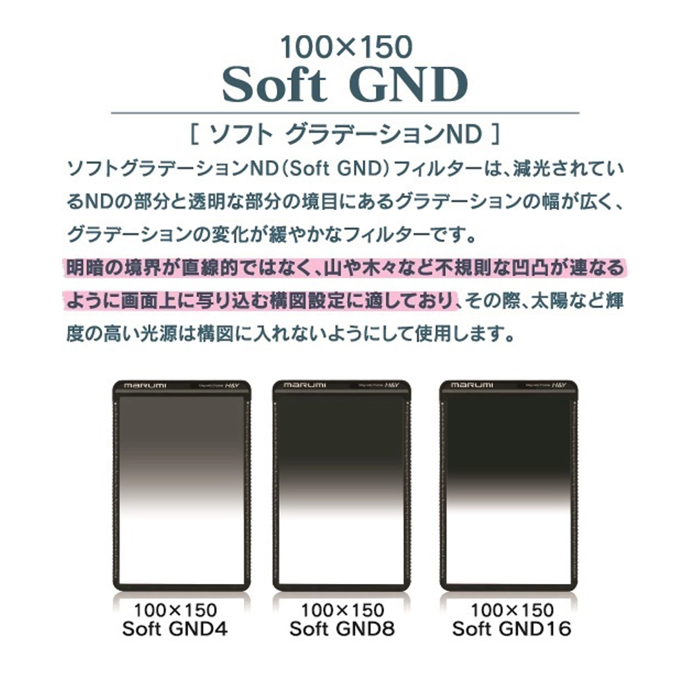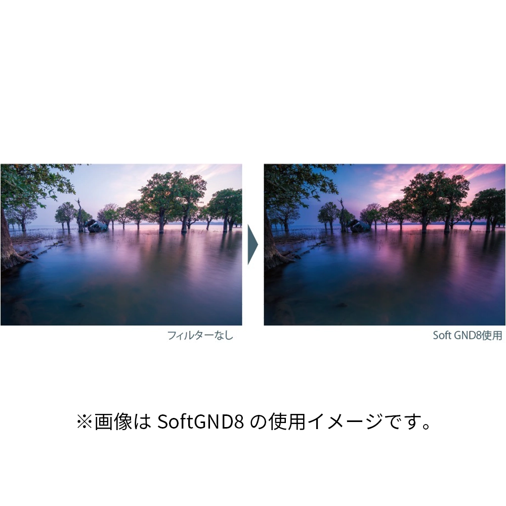 ソフトグラデーションND(SoftGND)フィルターは、減光されているNDの部分と透明な部分の境目にあるグラデーションの幅が広く、グラデーションの変化が緩やかなフィルターです。 明暗の境界が直線的ではなく、山や木々など不規則な凹凸が連なるように画面上に写り込む構図設定に適しており、太陽など輝度の高い光源は構図に入れないようにして使用します