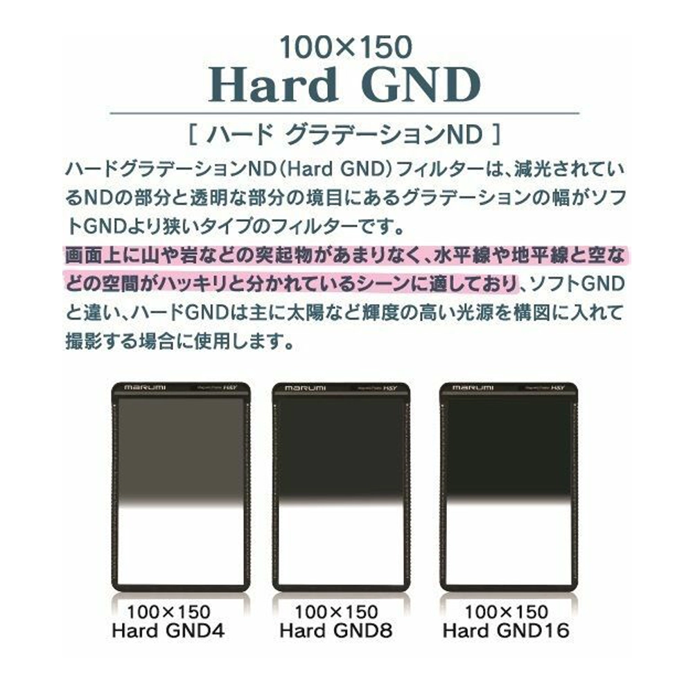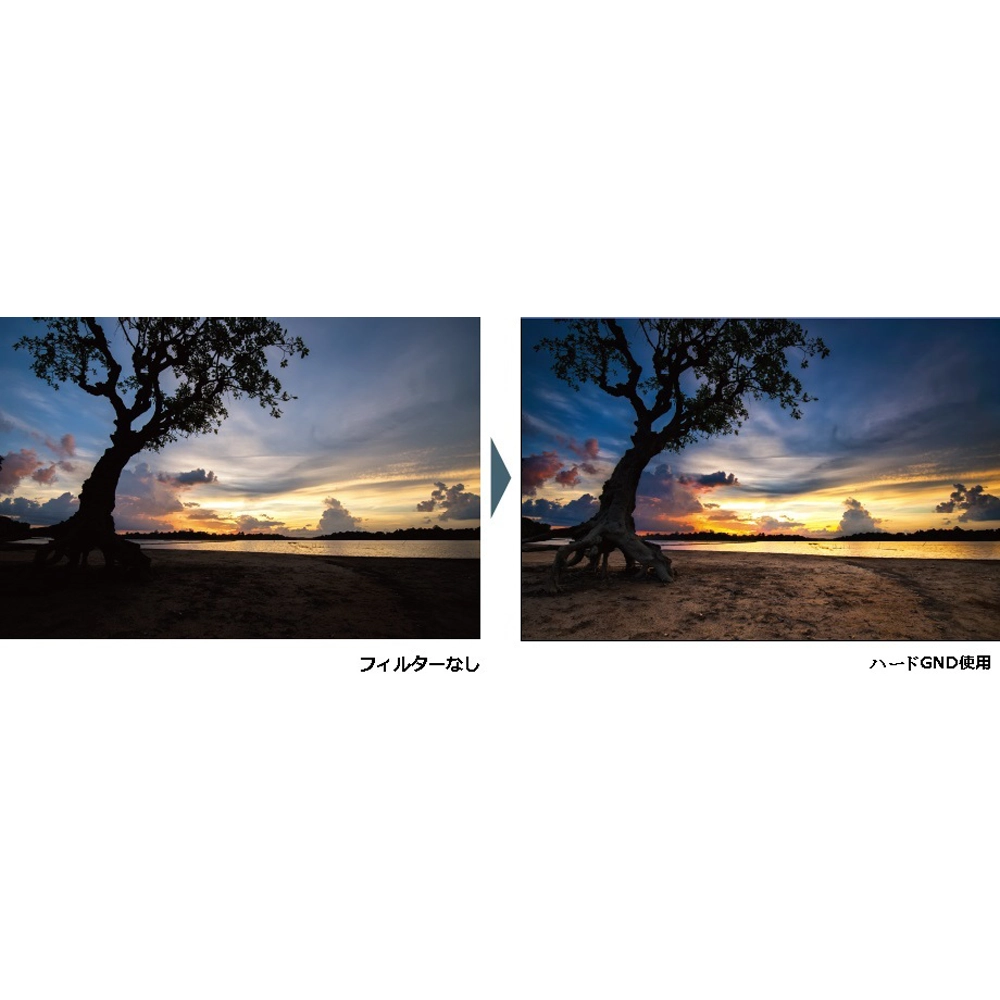ハードグラデーションND(HardGND)フィルターは、減光されているNDの部分と透明な部分の境目にあるグラデーションの幅がソフトGNDより狭いタイプのフィルターです。 画面上に山や岩などの突起物があまりなく、水平線や地平線と空などの空間がハッキリと分かれているシーンに適しており、ソフトGNDと違い、ハードGNDは主に太陽など輝度の高い光源を構図に入れて撮影する場合に使用します。