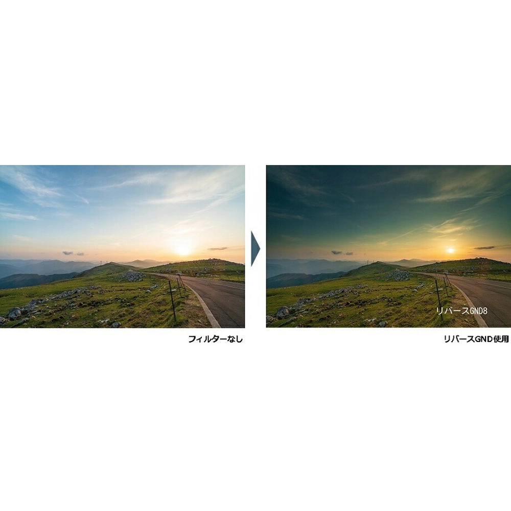 リバースグラデーションND(ReverseGND)フィルターは、中央部が最も濃く、またグラデーションの幅が狭く、上部にかけて境目なく緩やかにグラデーションが施されたフィルターです。 朝日や夕日など輝度の強い光源が、水平線や地平線から完全に出ている状態の撮影に最適です。