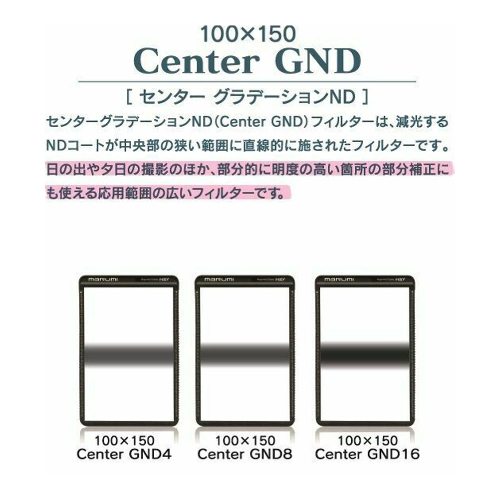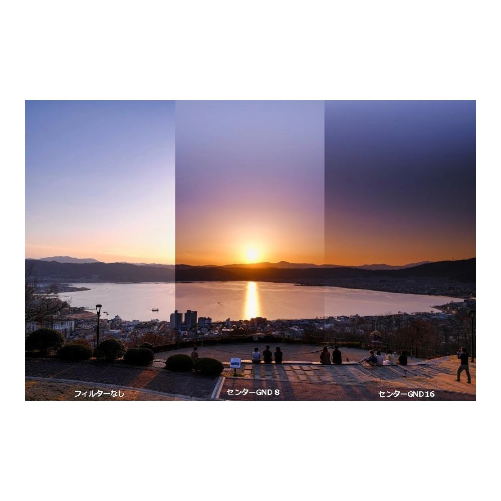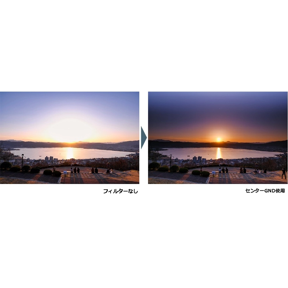 センターグラデーションND(CenterGND)フィルターは、減光するNDコートが中央部の狭い範囲に直線的に施されたフィルターです。日の出や夕日の撮影のほか、部分的に明度の高い箇所の部分補正にも使える応用範囲の広いフィルターです。