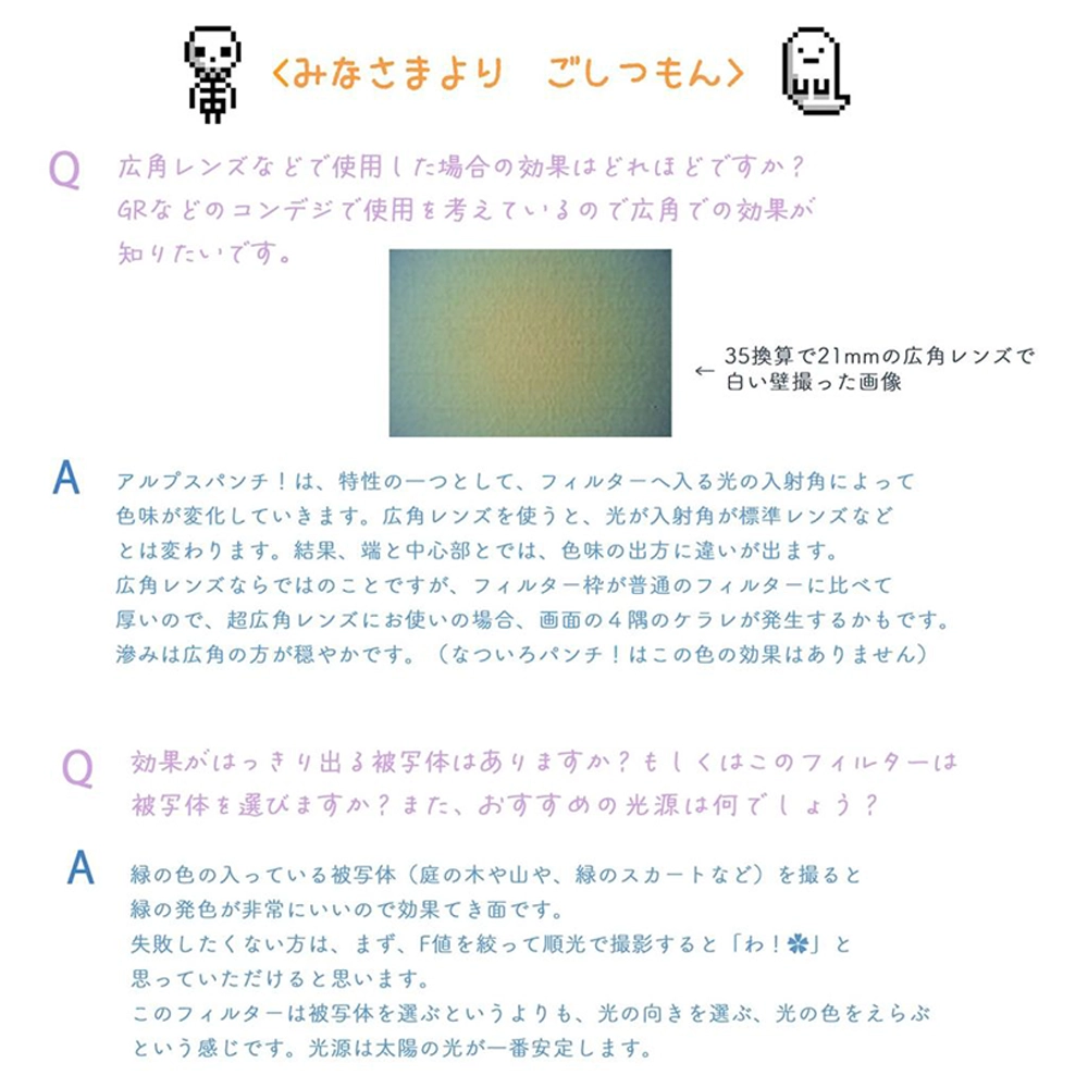 コーティングを2枚のガラスの表裏、合計4面に施すことで緑や暖色系の色味を強調し、マゼンタ色のゴーストが出やすくなっています。またこの2枚は一定の空間を設けて枠内に配置されているので、ガラスの内面反射によるゴースト・フレアや、パープルフリンジに似た効果も得られます。広角レンズに使用した場合には、光の入射角依存性によって、あたかもオールドレンズで撮ったかのような、周辺減光に似た面白い効果も出ます。