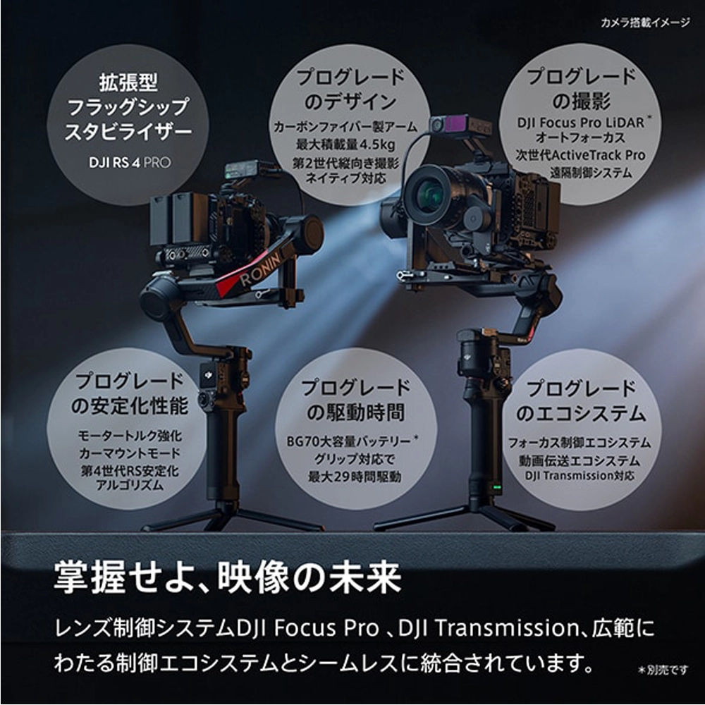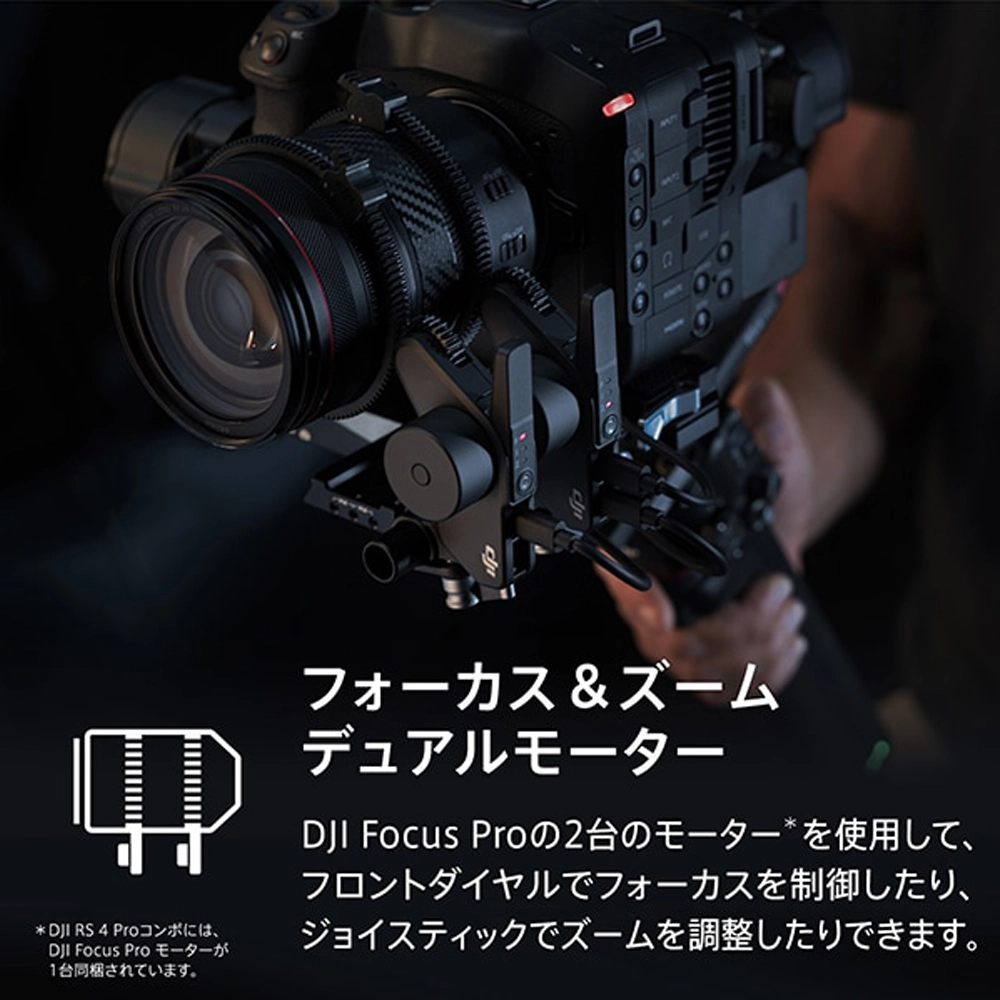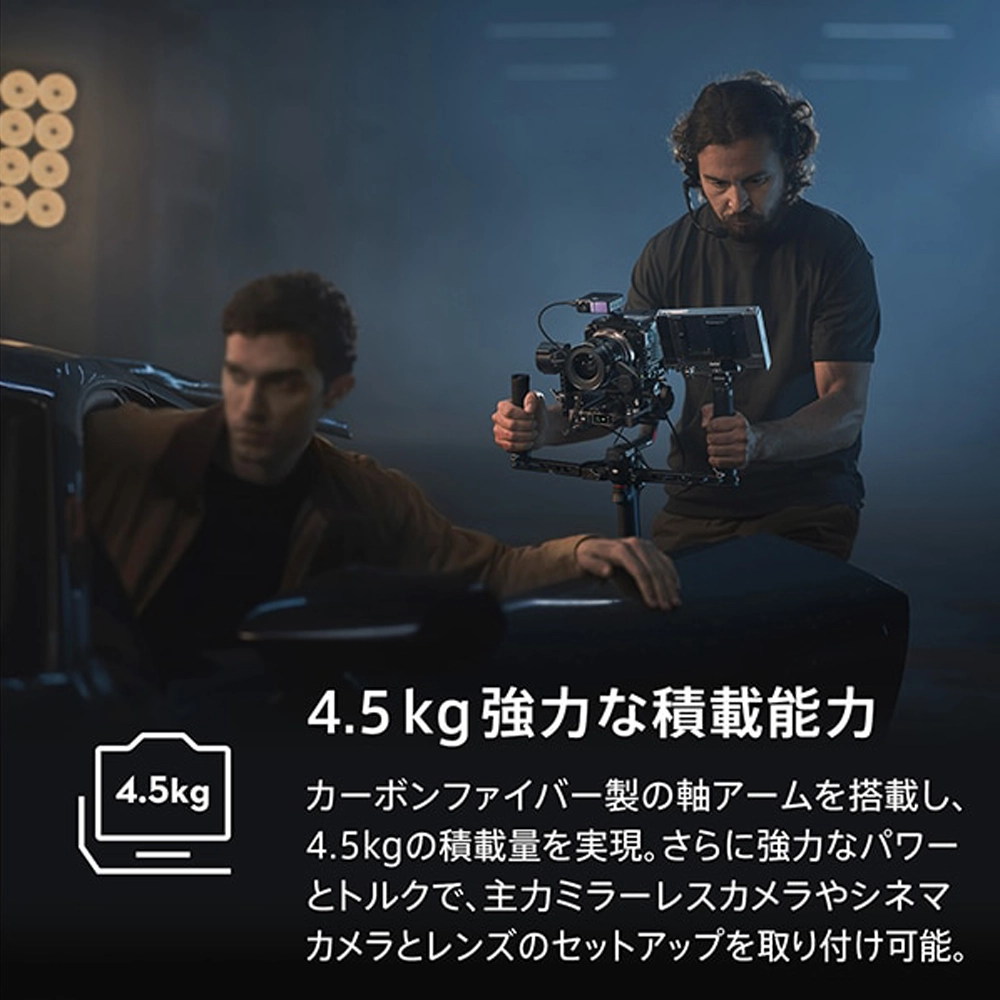 カーボンファイバー製の軸アームを搭載し、DJI RS 4 Proは、4.5kgの積載量を誇り、さらに強力なパワーとトルクで、主力ミラーレスカメラやシネマカメラとレンズのセットアップを簡単に取り付けることができます。