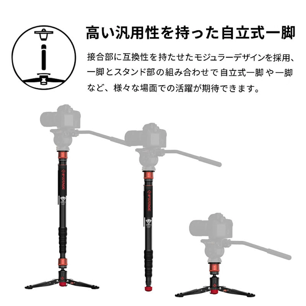 接合部に互換性を持たせたモジュラーデザインを採用、通常の一脚としての運用やスタンド部をローアングル三脚としての運用も可能です