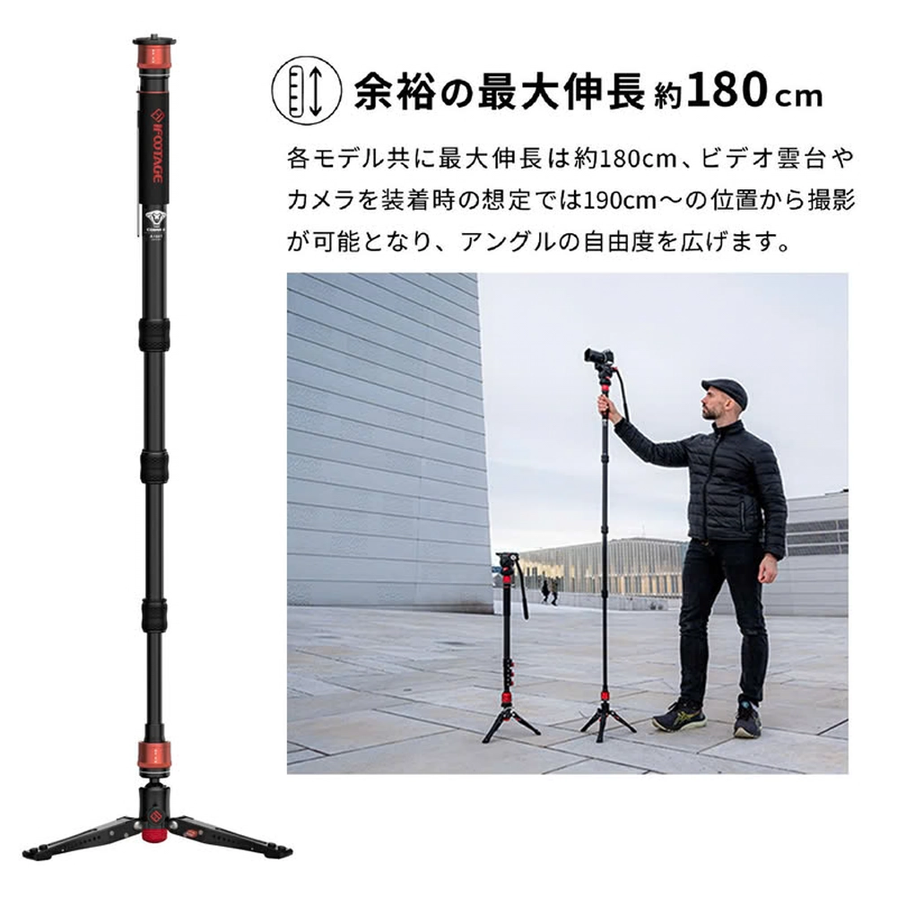 COBRA3 A180Tは、高品質アルミニウムを採用、軽量ながらも高い剛健性を持つ自立式一脚です。スタンド式のビデオ用一脚として動画撮影はもちろん、スタンド部分を外しスタンダードな一脚としての使用や、スタンド部を小型のローアングル三脚として使用と3通りの使い方が可能です。