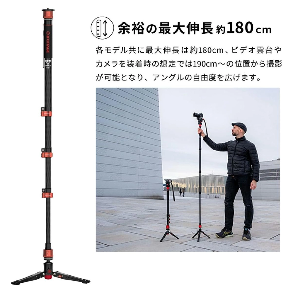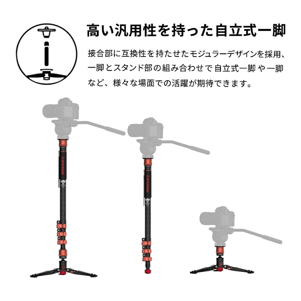 iFootage COBRA3 C180Fは高品質カーボンを採用、軽量ながらも高い剛健性を持つ自立式一脚です。新たにクイックリリースシステムを採用、従来品と比べてプレートの着脱時間が大幅に短縮されました。スタンド式のビデオ用一脚として動画撮影はもちろん、スタンド部分を外しスタンダードな一脚としての使用や、スタンド部を小型のローアングル三脚として使用可能。3通りの使い方が楽しめます。