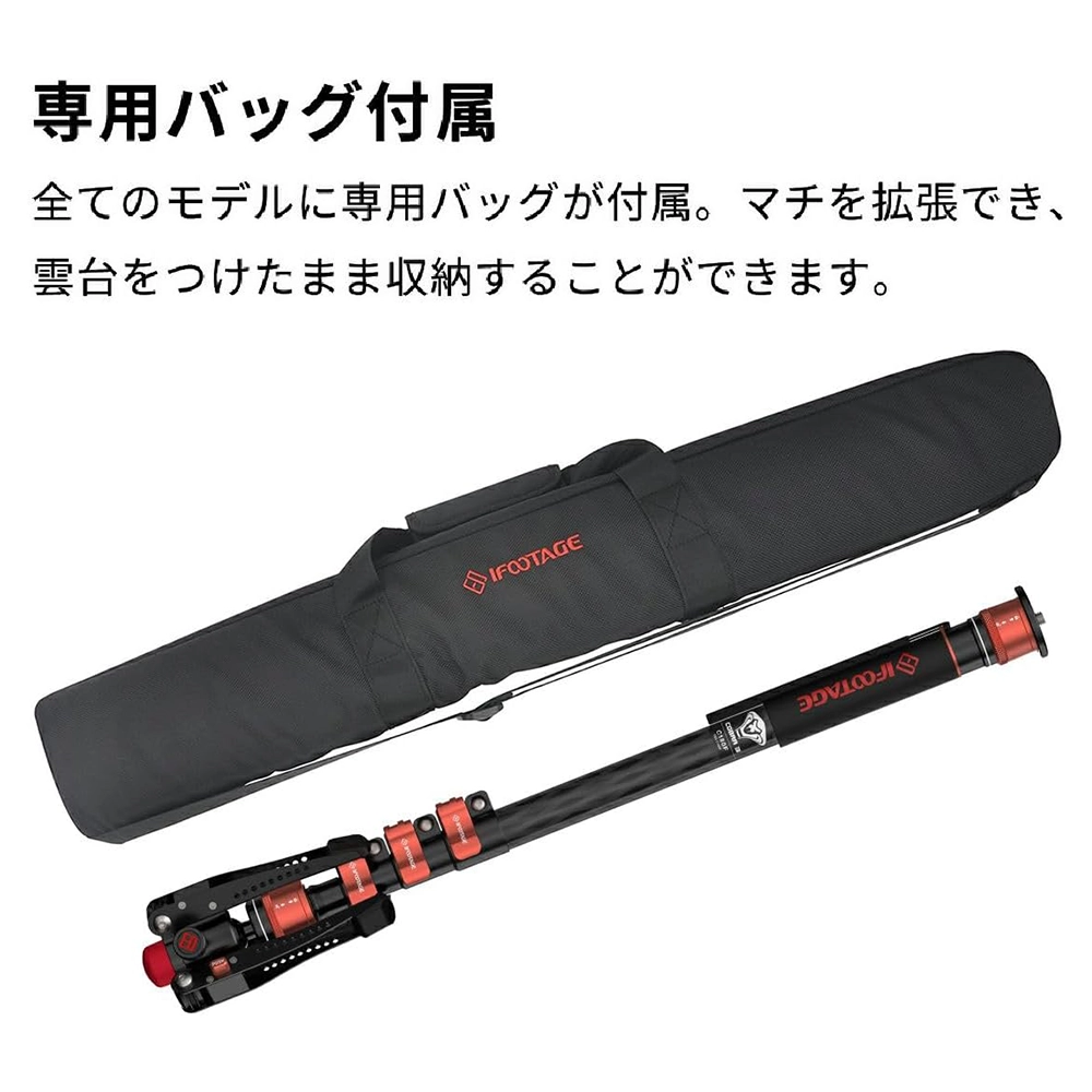 専用バッグが付属。マチを拡張することができ、雲台をつけたまま収納することができます。