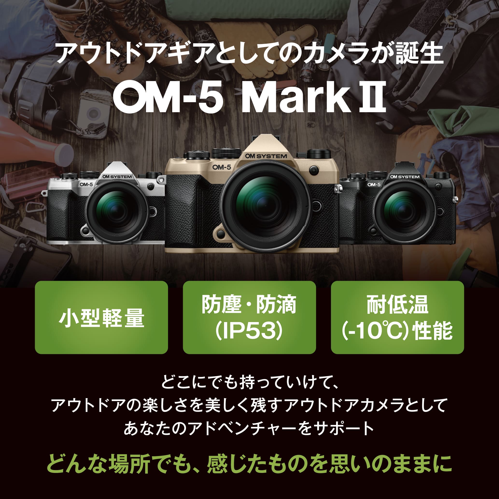 アウトドアで体験したシーンを、単なる記録でなく、作品として鮮やかに写し、残すことができるアウトドアギアとしてのレンズ交換式カメラです。