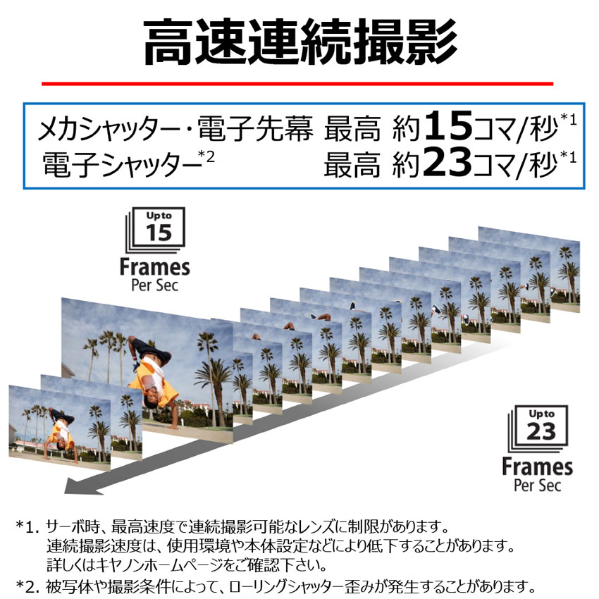 - 最高約15コマ/秒(メカシャッター/電子先幕)、最高約23コマ/秒(電子シャッター)