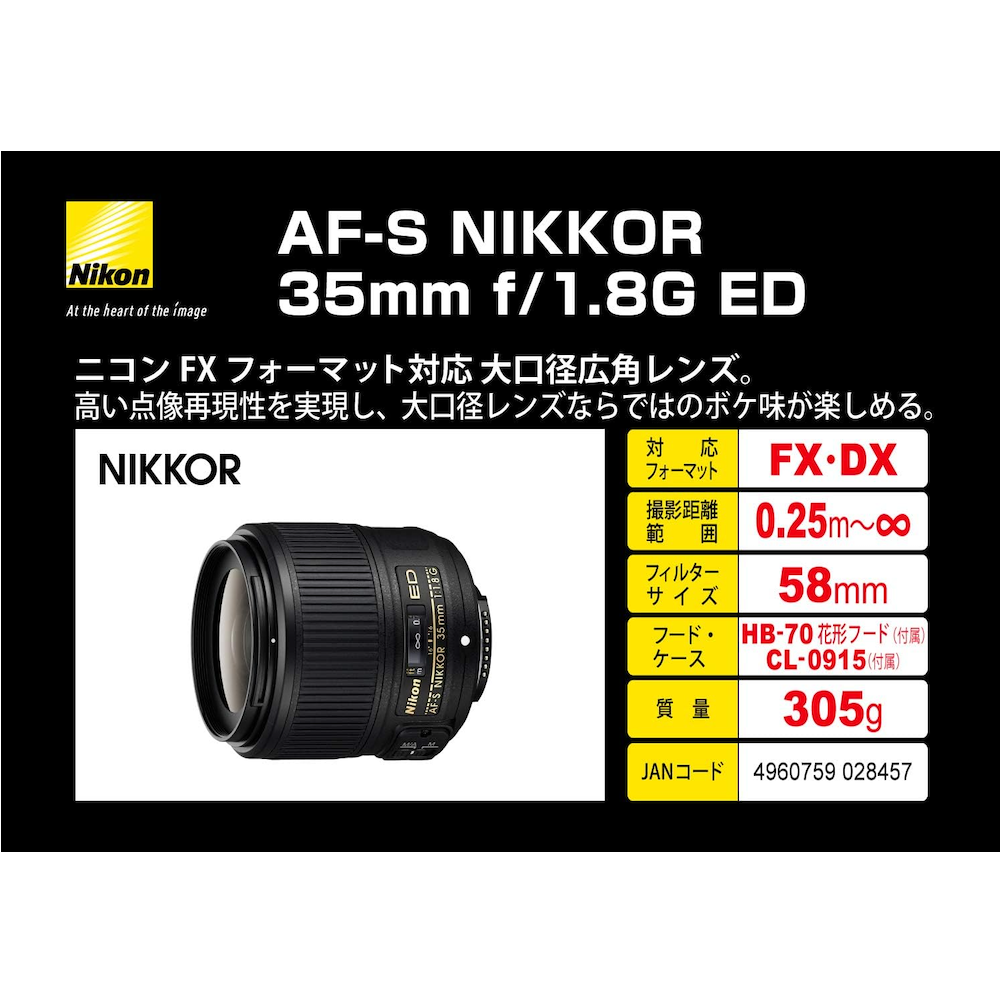 焦点距離35mm※で広がりと奥行きのある広角撮影が楽しめる、FXフォーマット対応の大口径広角単焦点レンズです。開放F値1.8でファインダー像が明るく、快適な撮影が可能。人物の背景をやわらかく大きくぼかしたポートレート撮影も楽しめます。広角レンズでも見た目に近い自然な表現ができるため、風景や建物の撮影からスナップ撮影まで幅広く活用できます。