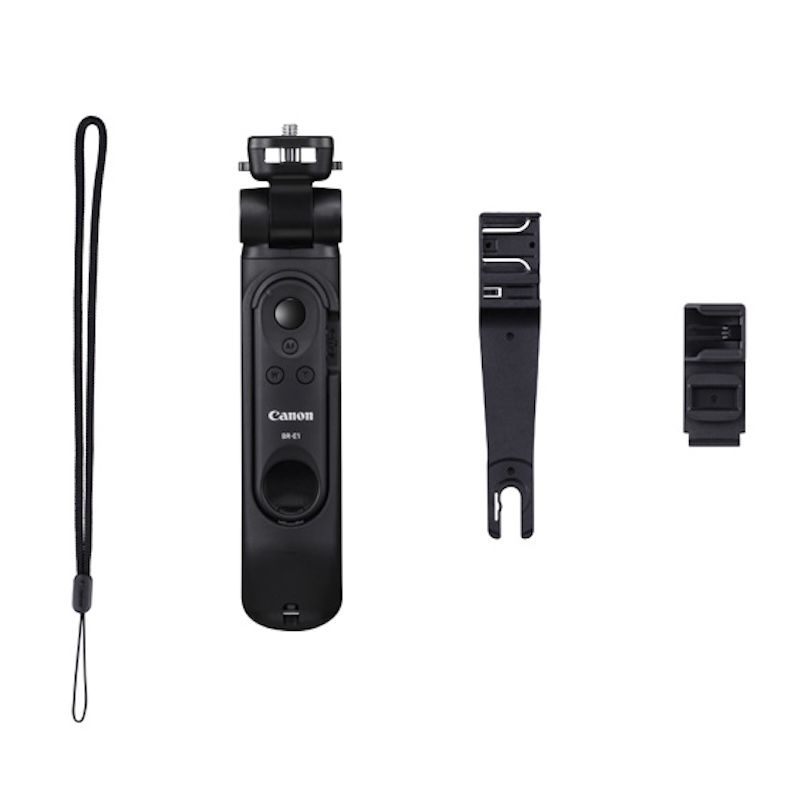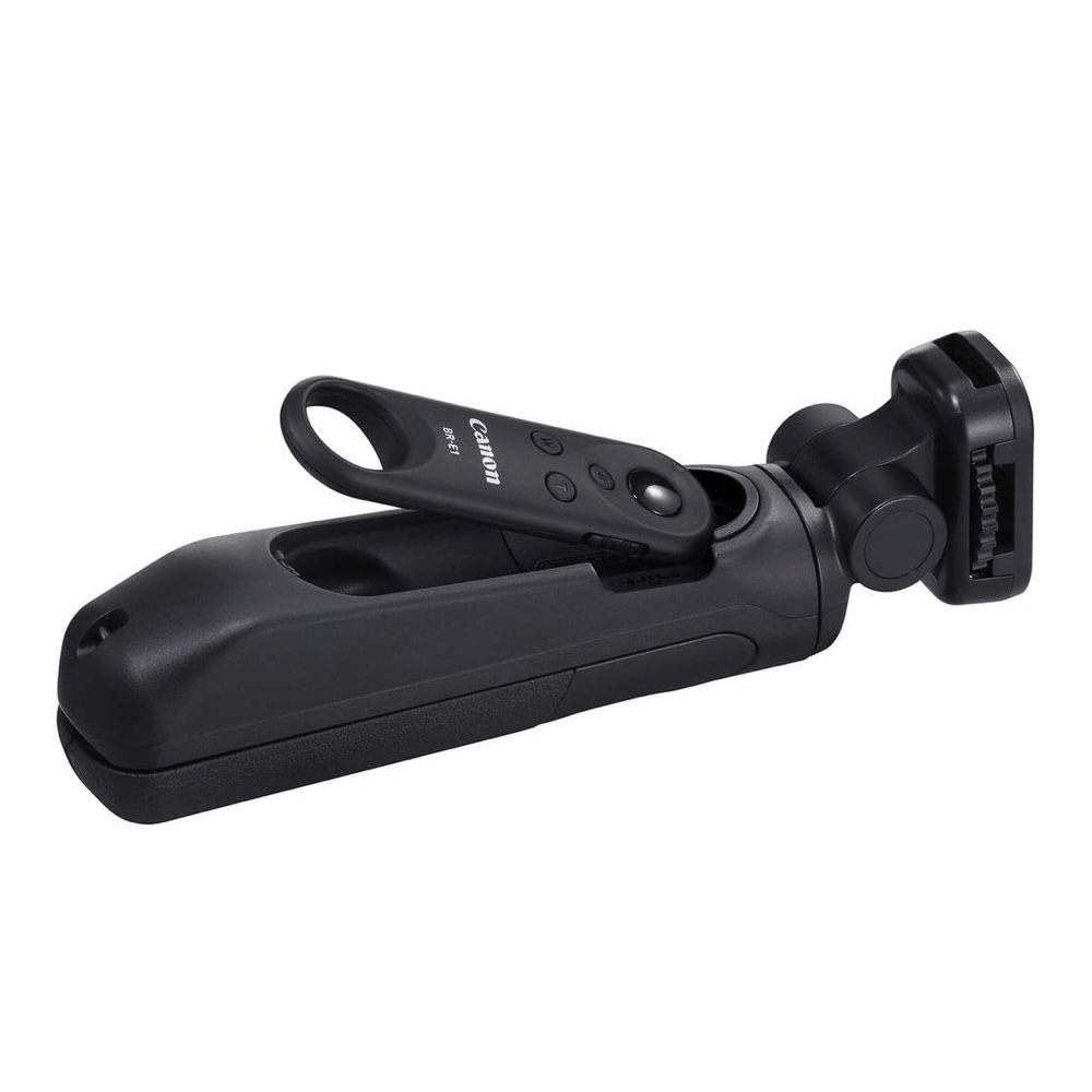 グリップ部を開き小型三脚としての使用も。同梱のワイヤレスリモートコントローラー「BR-E1」を取り外すことで、離れた場所からのAFの調整やリモート撮影ができます。カメラ台座の角度を調整し、縦動画対応カメラ※を縦位置にすれば、画角を確認しながら全身の自撮り撮影も可能です。