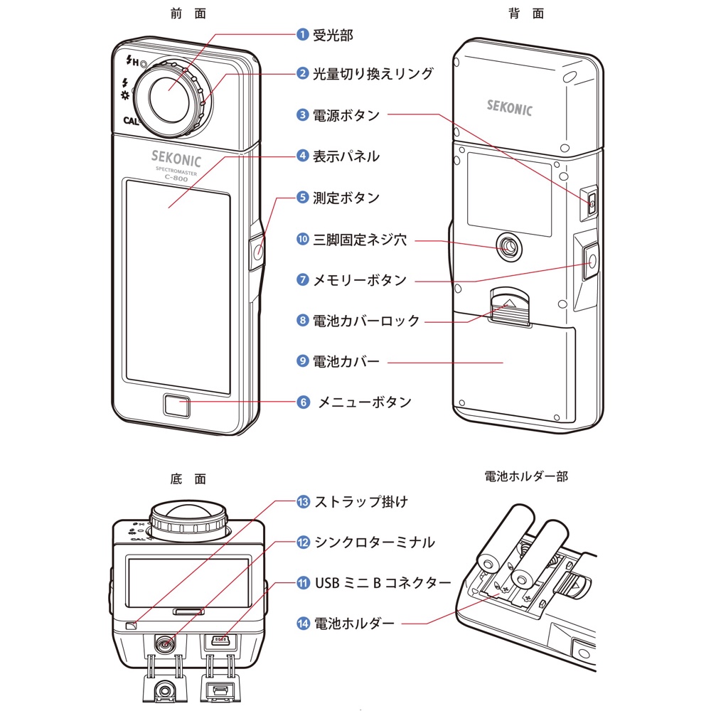 C-800は受光部にCMOSリニアイメージセンサーを採用。正確な色温度を求めるため380nm~780nmの波長域で分光測定を行います。従来使われてきたフラッシュ光、定常光光源(タングステン光やHMIなど)だけではなく、近年撮影現場で増加しているLEDや蛍光灯などの光源も正確に測定することができます。