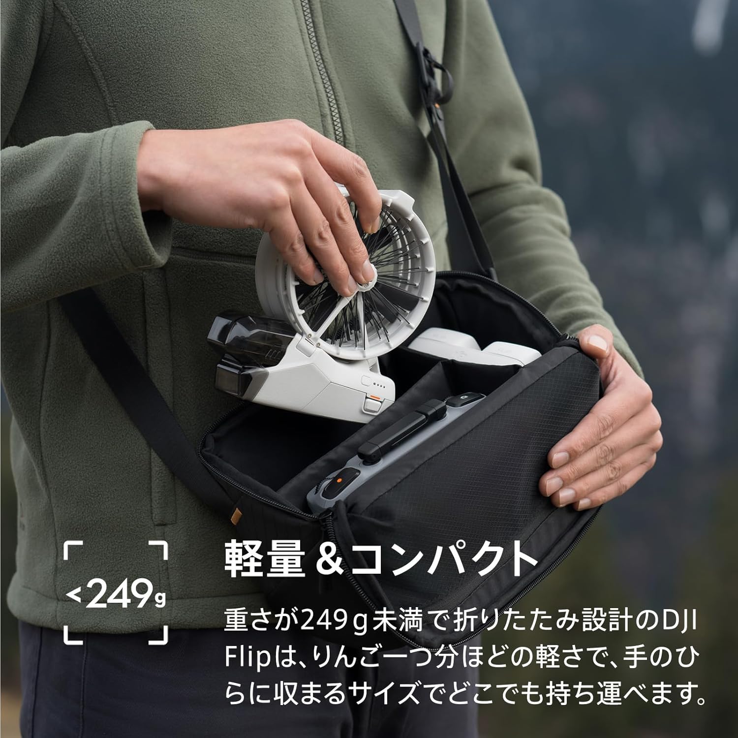 DJI Flipの重さは249 g未満で、およそリンゴ1個分です。ほとんどの国や地域では、トレーニングや試験が不要です。