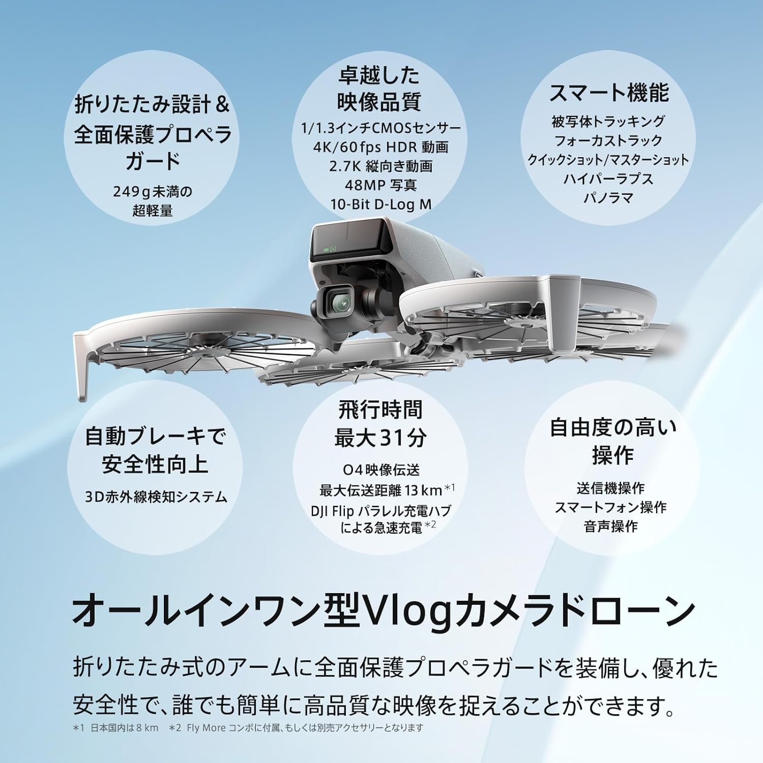 | 最大航続距離 | 14 km ※無風、海抜20 m、定速9 m/s、写真モードで測定。実際は環境や使用条件で変動。 |