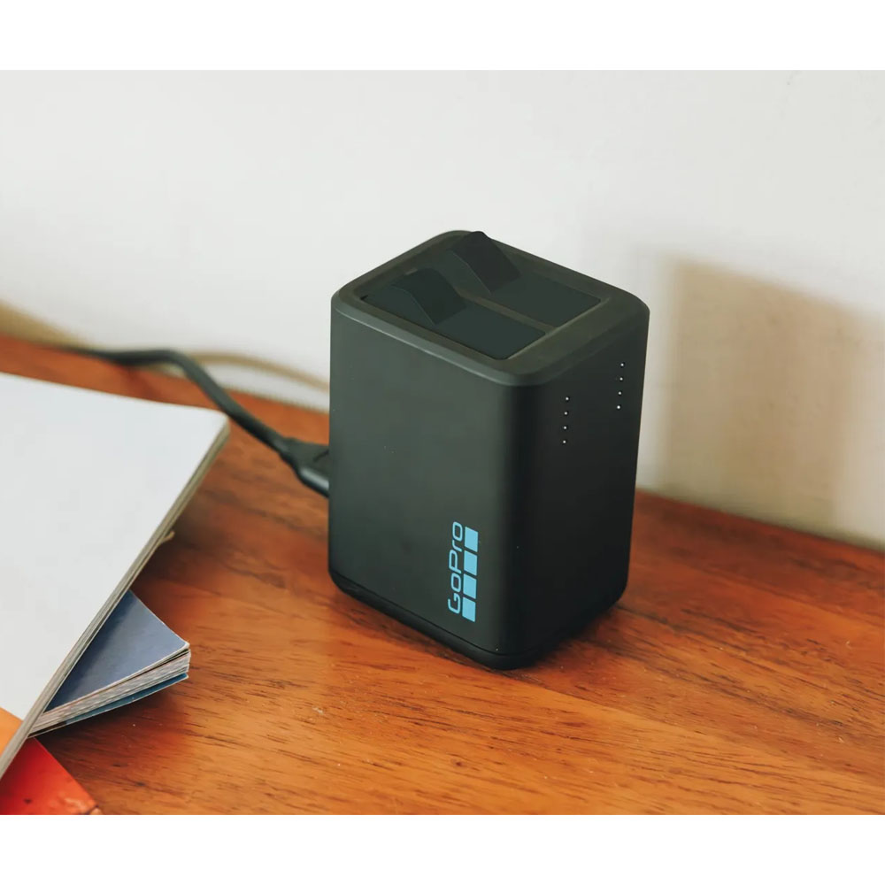 2個のバッテリーを同時に充電できるデュアルバッテリーチャージャーなら、HERO13 Blackをいつでも途切れずに使い続けられます。電源に接続していない場合でも、ステータスライトでバッテリーの充電状態を簡単に確認できます。高性能Enduroバッテリー2個は、カメラに付属のバッテリーの交換用またはスペアとして利用できます。