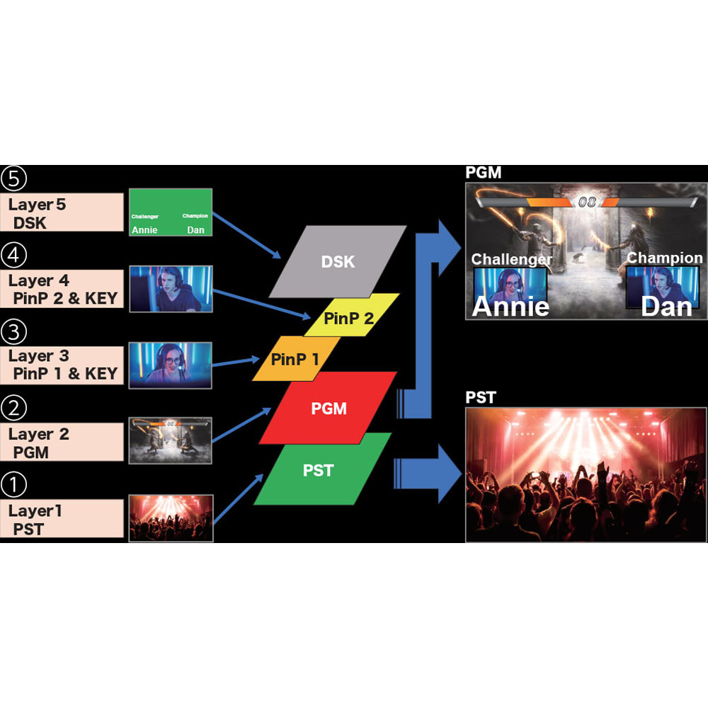 - レイヤー③-④:PinPまたはクロマ・キー、ルミナンス・キーを配置