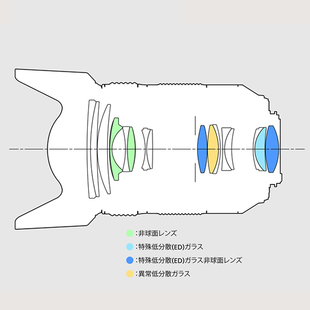4枚の非球面レンズを含む10群16枚の贅沢なレンズ構成は、中心から周辺部まで絞り開放からクリアでコントラストの高い、優れた描写性能を実現。きわめて高い色収差低減効果が得られるEDガラスを1枚、EDガラス非球面レンズを2枚、異常低分散ガラス1枚を採用することでズーム全域の色収差を抑制しています。また、可視光域における平均反射率を従来比で約50%以下に抑えた高性能マルチコーティング“HDコーティング(※1)”を採用することで、逆光など光線状態の厳しい撮影条件下でのゴーストやフレアーの発生を効果的に抑えています。