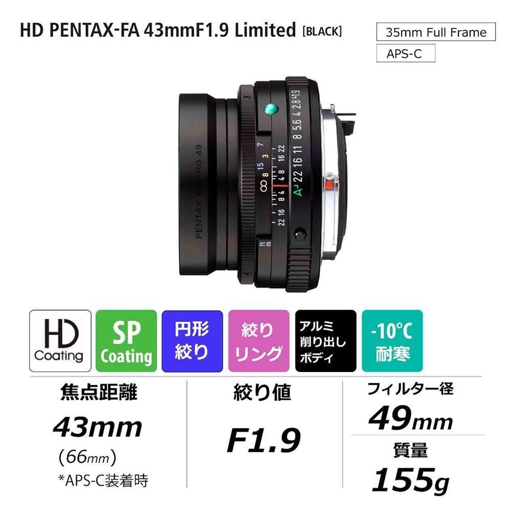 発売から20数年のロングセラーとなったsmc PENTAX-FA 43mmF1.9 Limitedの持ち味に加えて、新たにHDコーティングを採用し、悪条件下でもクリアでヌケの良い描写を実現、また円形絞りの採用により開放からF3.5まで絞り込んでも自然で美しいボケが得られます。