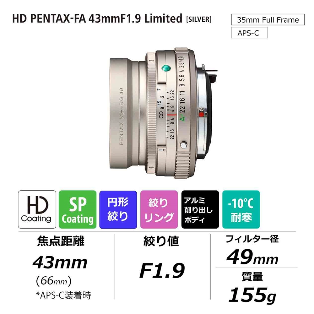 発売から20数年のロングセラーとなったsmc PENTAX-FA 43mmF1.9 Limitedの持ち味に加えて、新たにHDコーティングを採用し、悪条件下でもクリアでヌケの良い描写を実現、また円形絞りの採用により開放からF3.5まで絞り込んでも自然で美しいボケが得られます。