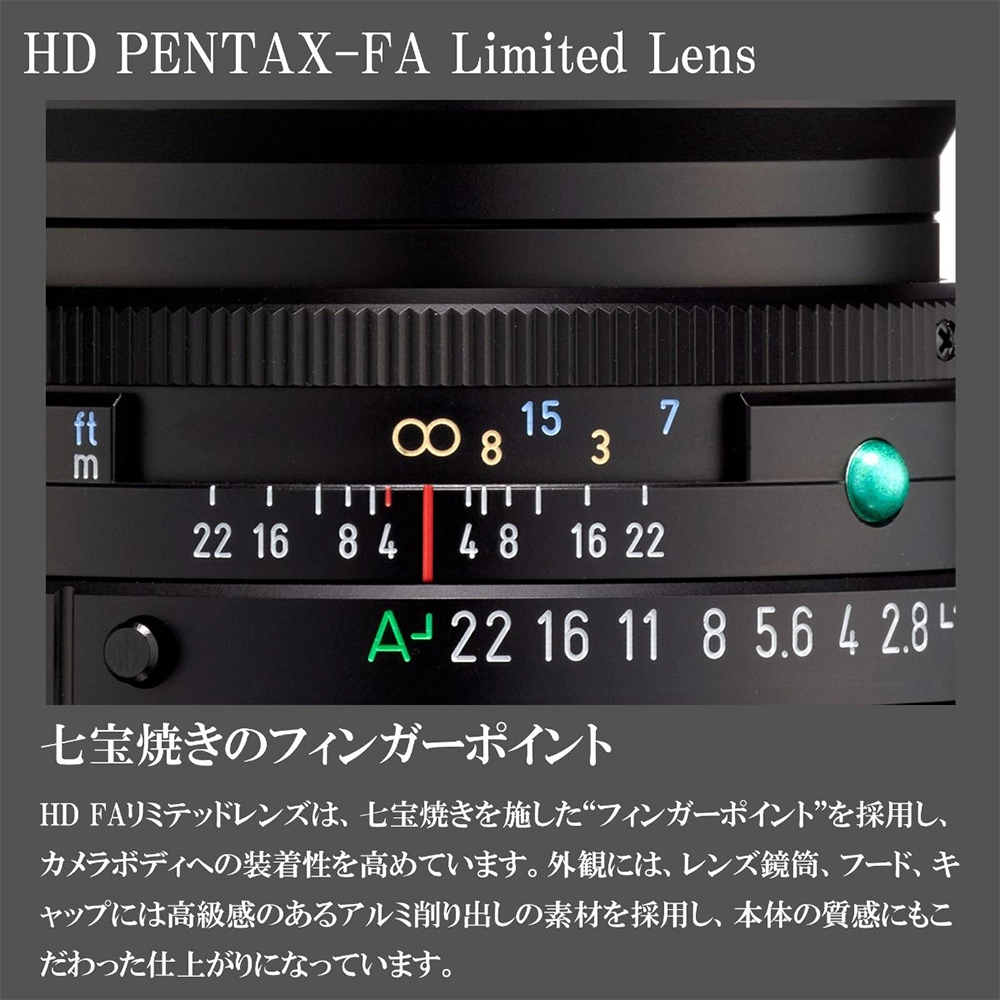 「リミテッドレンズ」シリーズの設計コンセプトを踏襲し、試験機等による数値評価だけでなく、実写による画質評価を繰り返して設計にフィードバックすることで“レンズの味”までも追求しています。外観においては、レンズ鏡筒、フード、キャップには高級感のあるアルミ削り出しの素材を採用し、本体の質感にもこだわった仕上がりになっています。また、七宝焼きを施した“フィンガーポイント”を採用し、カメラボディへの装着性を高めています。