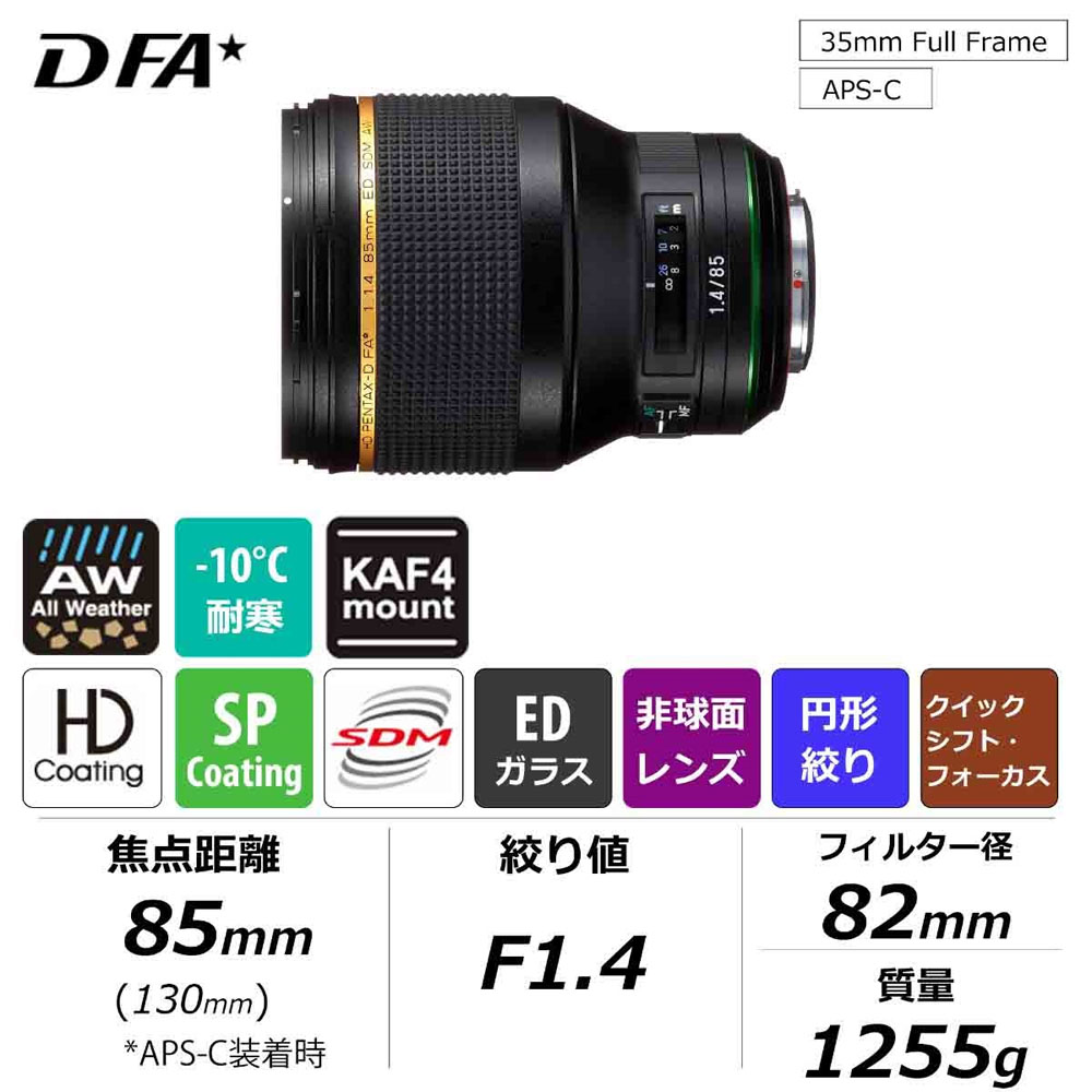 今後カメラ本体がさらなる進化を遂げることを想定し、特に解像力の大幅な向上を実現した新世代の「★(スター)」レンズとして極限まで諸収差を補正し、中心から周辺までシャープでクリアな高い描写力を実現しています。絞り開放から極めて高い解像性能が得られ、加えてボケ味の美しさや近距離での描写性能も高めています。開放F値が1.4と極めて明るいため、ポートレート撮影をはじめ、室内での手持ち撮影や、風景撮影においても背景のボケ味を生かした写真表現が可能で、写真を撮りたくなる気持ちが駆り立てられるような明るいファインダー像が得られます。