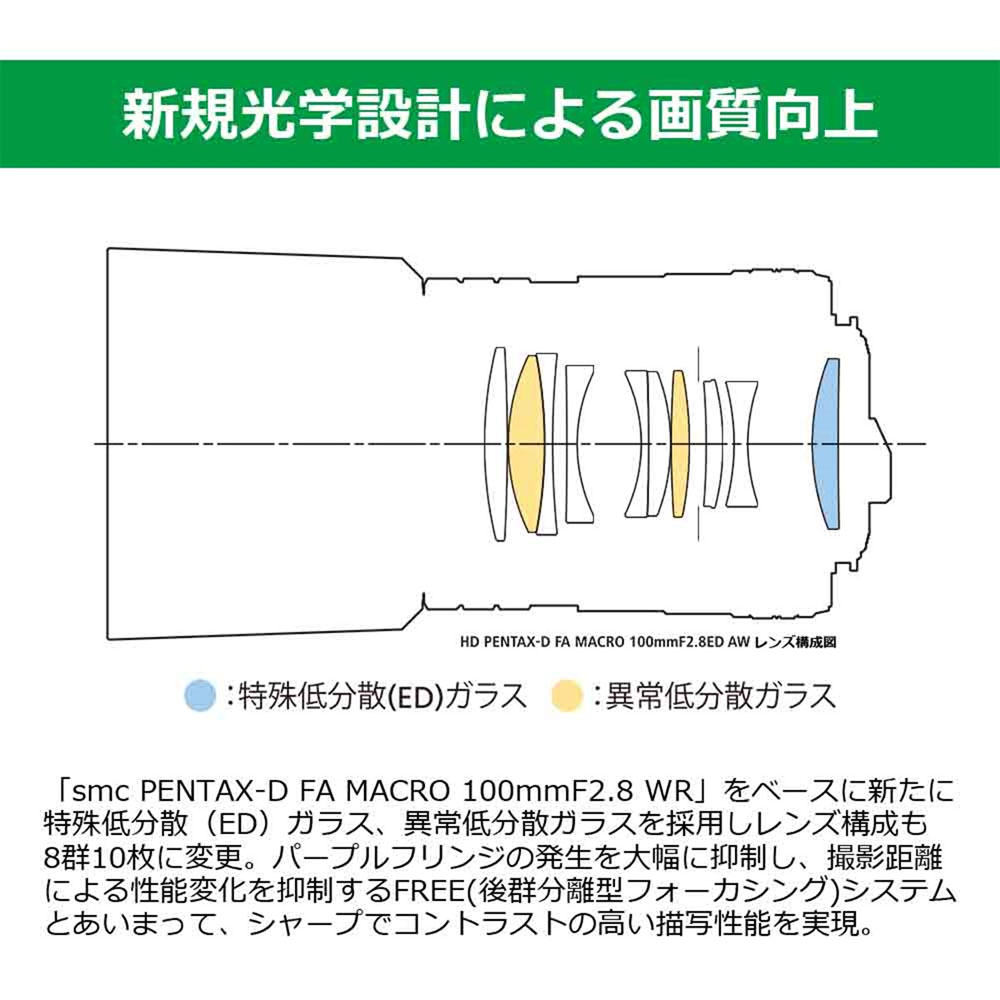 レンズ先端から被写体まで13cmの距離で等倍の撮影が可能なマクロレンズ。新たに特殊低分散(ED)ガラス、異常低分散ガラスを採用した新設計の光学系により、パープルフリンジの発生を抑制。さらにHDコーティングを採用することで、ゴーストやフレアーを抑制し、全撮影距離で、シャープでコントラストの高い描写性能を実現。また円形絞りの採用により、背景のボケ味を美しく描写します。高品位なアルミ合金ボディにすることで、小型軽量を実現し、気密性を高めた防塵・防滴構造(AW)を新たに採用しています。