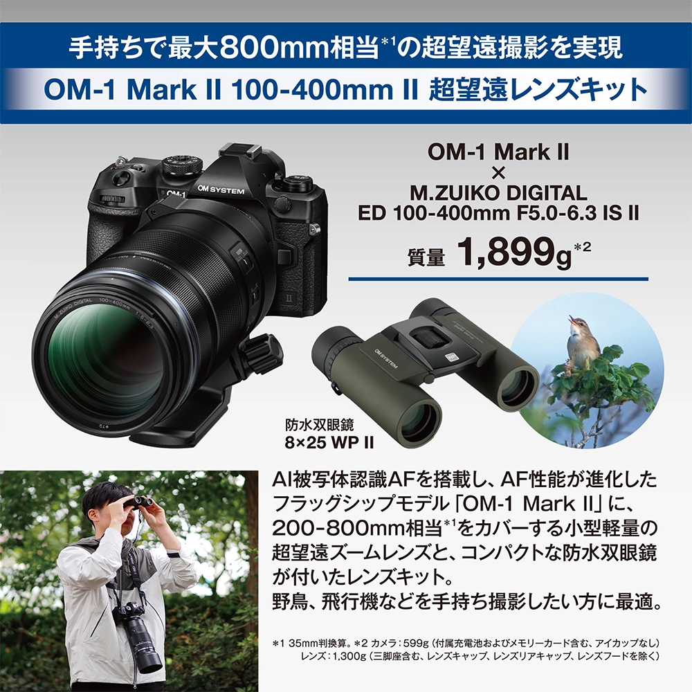 超望遠ズームレンズ「M.ZUIKO DIGITAL ED 100-400mm F5.0-6.3 IS II」と、双眼鏡「8×25WP II フォレストグリーン」が付属するセットです。