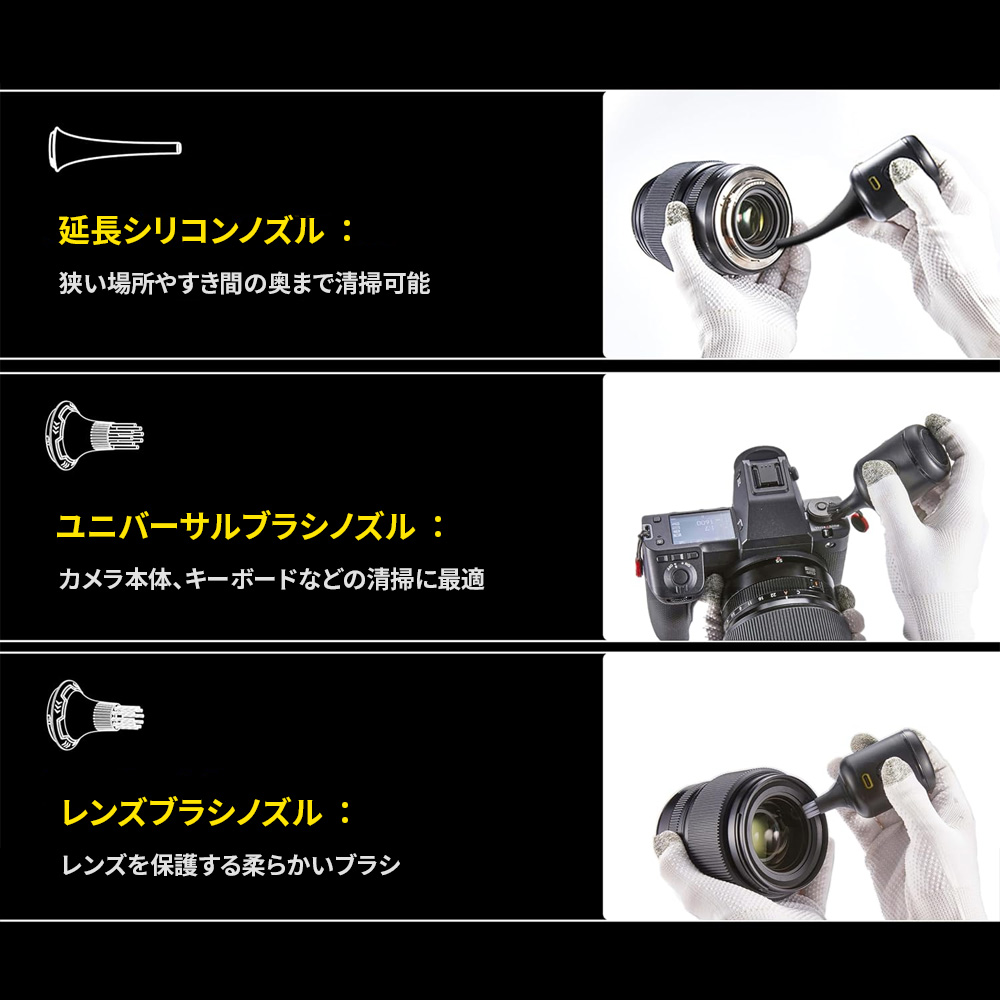 - ユニバーサルブラシノズル:カメラボディ、プラモデルやキーボード掃除に最適