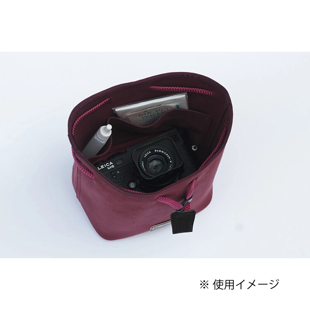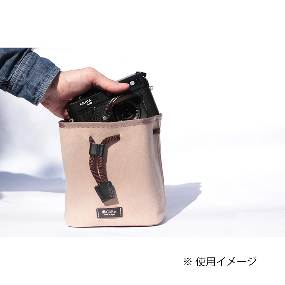 カメラを傷つけない優しいデザインとは、開口部に金具やファスナーを使わないこと。程よい厚みとしなやかさをもつ巾着タイプのポシェットが、あなたの大切な愛機を守ります。手紐を緩めて開口部を広げオープンにすると、お気に入りのバッグの中にカメラスペースを作ることができます。このプロダクトは、”包む感覚で守る”をコンセプトにした蔵CURAの新しいカメラポシェットです。
