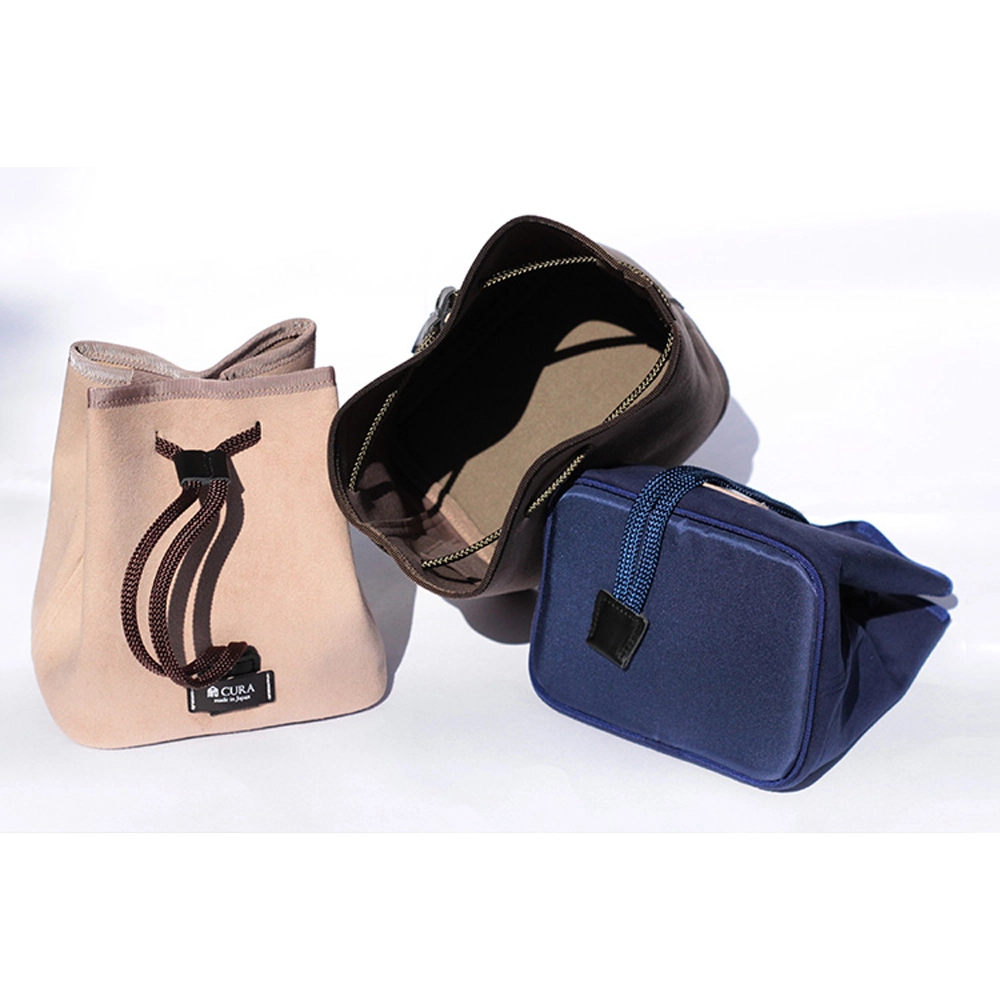 内装にはサイズ違いのオープンポケットがありスモールアクセサリーを仕分けることができます。カメラを傷つけない必要最小限の保護性を保ちながら、バッグの中に納まりが良く、このポシェット一つバッグに入れればカメラと最低限のアイテムを持ち運べます。蔵CURAが刻印されたコードバン革は、締め切った際に遊びがちになる手紐の“鞘”になるようデザインされました。