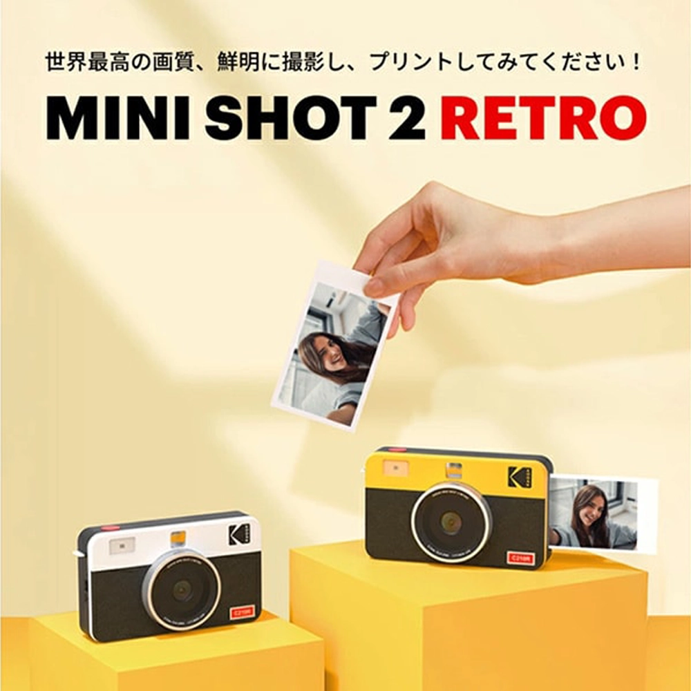 「 Kodak Mini Shot RETRO 」は、撮ったその場で簡単にプリントができ、スマートフォンから専用アプリを介して写真をプリントできる2-in-1モデルです。プリント方式は昇華型熱転写方式を採用しており、インクとプリント用紙が一体となった専用インクカートリッジを使用。出力プリントサイズは Mini Shot 2(54×86mm)。
