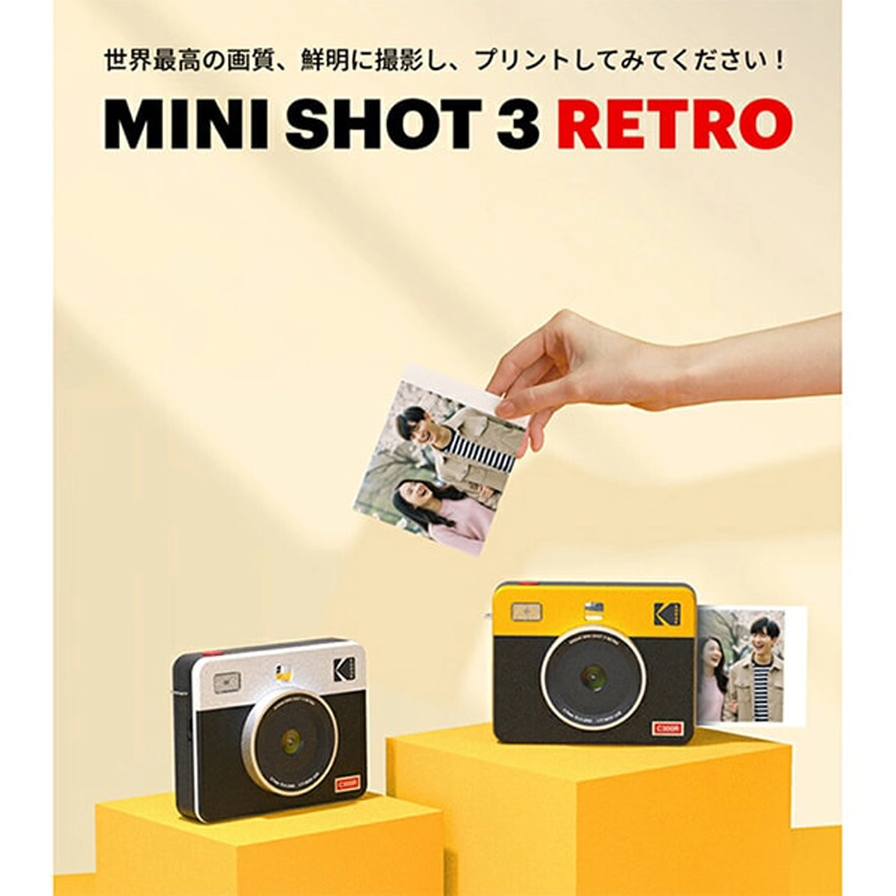 「 Kodak Mini Shot RETRO 」は、撮ったその場で簡単にプリントができ、スマートフォンから専用アプリを介して写真をプリントできる2-in-1モデルです。プリント方式は昇華型熱転写方式を採用しており、インクとプリント用紙が一体となった専用インクカートリッジを使用。出力プリントサイズは Mini Shot 3(76×76mm)。