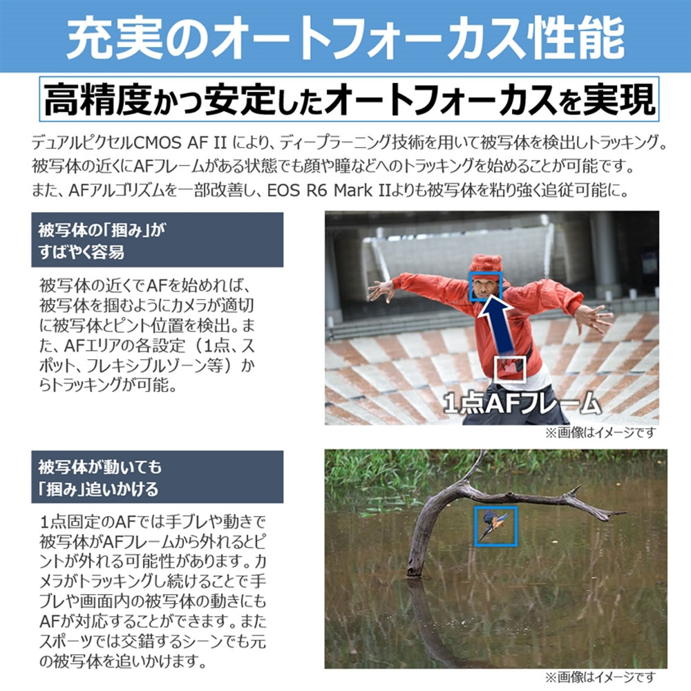 メカシャッター/電子先幕による撮影時は、AF/AE追従で最高約12コマ/秒、電子シャッターによる撮影時は、AF/AE 追従で最高約40コマ/秒の高速連写性能※5を備えながら、「EOS R6 Mark II」から連続撮影可能枚数が向上し、高いドライブ性能を保持しています。また、シャッターボタンを押したタイミングから最大20コマ分(約0.5秒)さかのぼって連続撮影することができる「プリ連続撮影※6」にも対応しています。さらに、「デュアルピクセルCMOS AF II」により、高速連写時も高精度かつ安定したフォーカスとトラッキングを提供する優れたAF性能を発揮します。