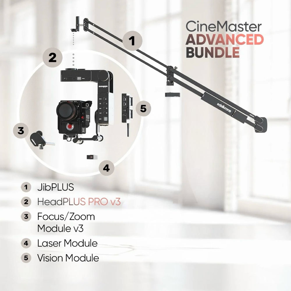 EdelkroneのCineMaster Bundle Advancedは、プロフェッショナルな映像制作のための包括的なソリューションを提供するバンドルです。このバンドルには、JibPLUS、HeadPLUS PRO v3、Focus/Zoom Module v3、Laser Module、Vision Moduleが含まれており、複雑なカメラ動作や精密な制御を可能にします。