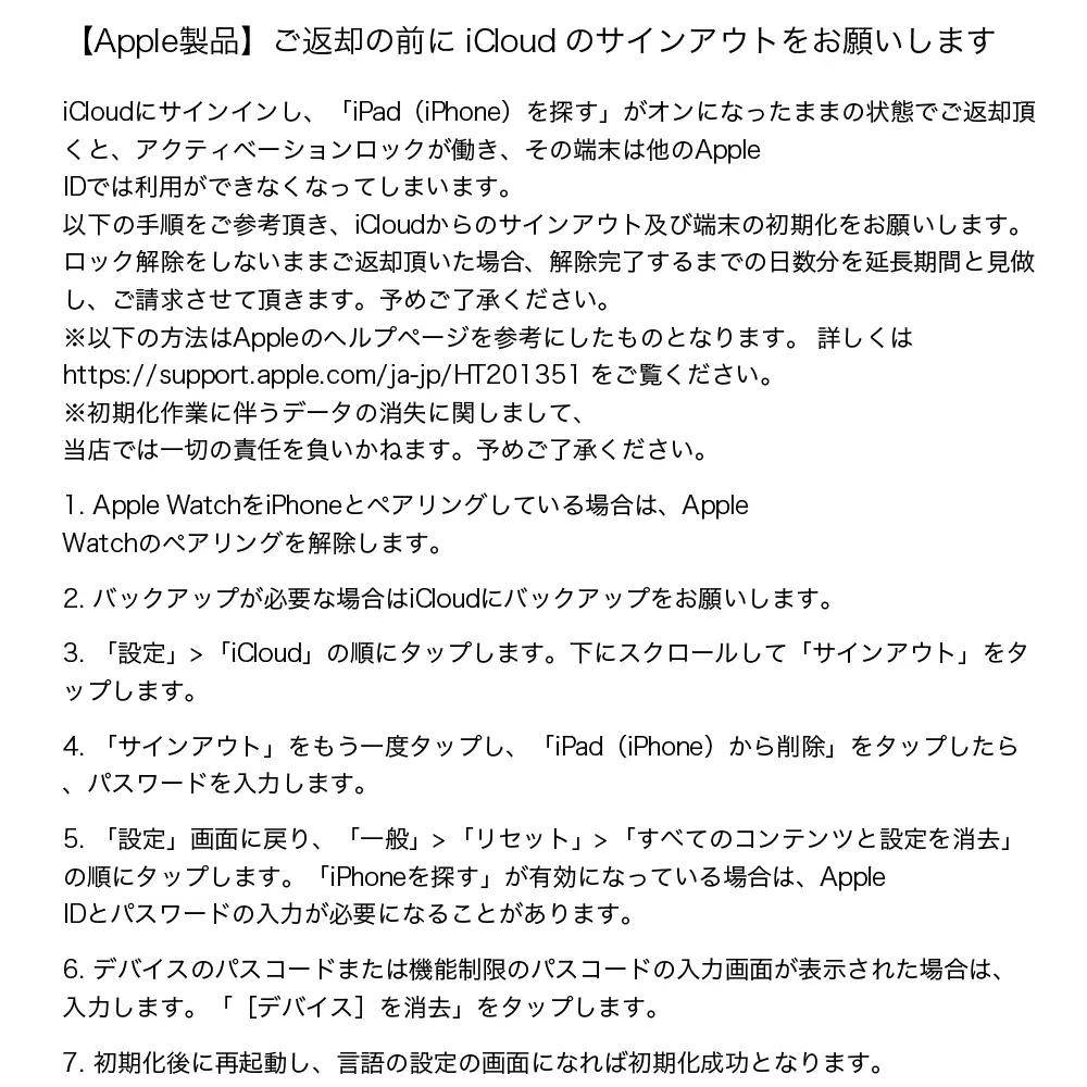 アクティベーションロックが設定されたまま返却された場合、解除が完了するまでの日数を延長期間として扱わせていただきます。あらかじめご了承ください。 -