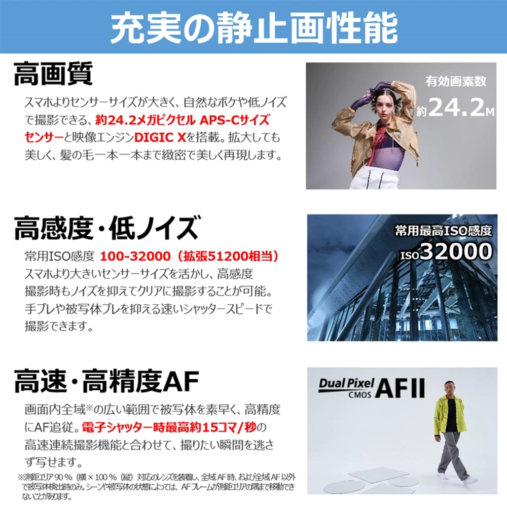 最大約2420万画素※APS-CサイズCMOSセンサーと映像エンジンDIGIC Xを搭載。自然で美しい大きなボケ味や暗がりでの高感度・低ノイズ撮影を実現します。