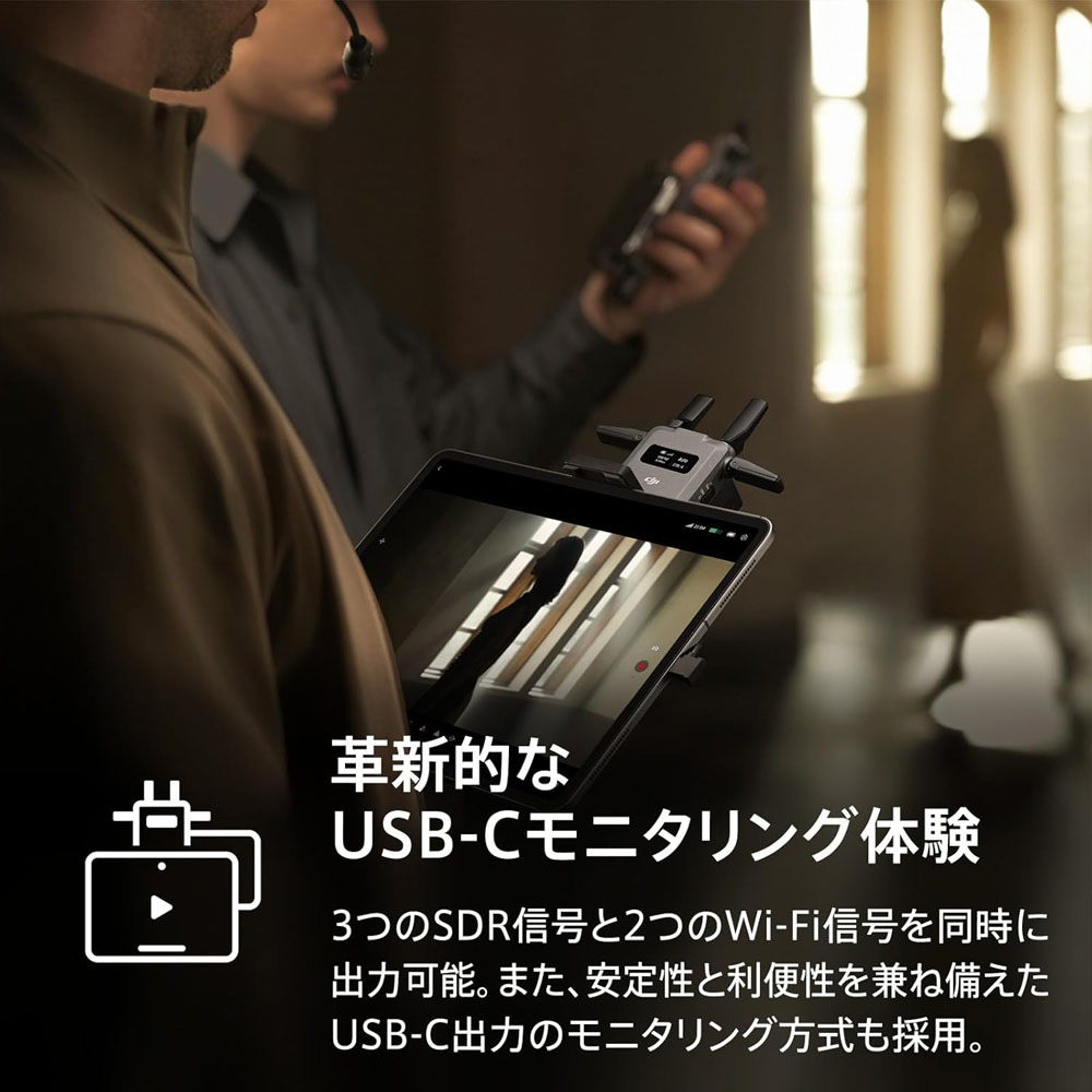 さらに、DJI SDR Transmissionでは、安定性と利便性を兼ね備えたUSB-C出力のモニタリング方式も採用しています。USB-Cケーブルでレシーバーをスマートフォンやタブレットに接続し、スムーズで安定したモニタリングを可能にします。