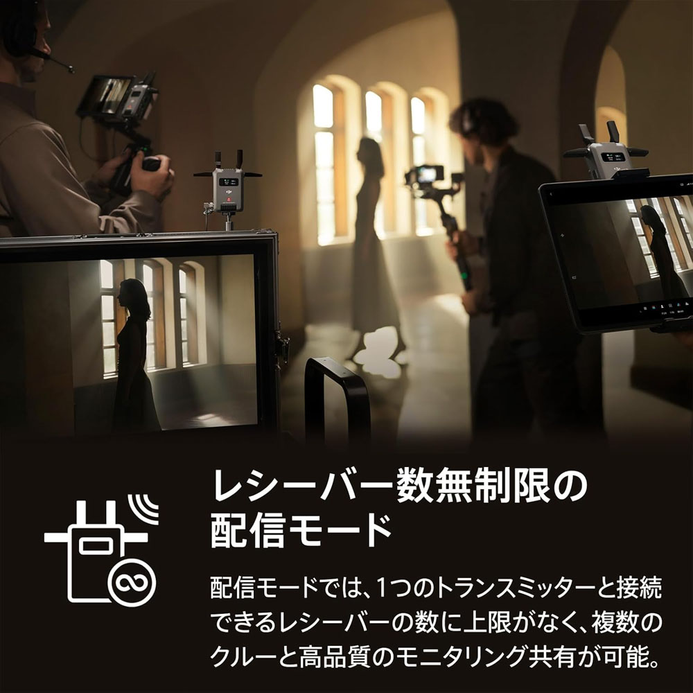 配信モードでは、1つのトランスミッターと接続できるレシーバーの数に上限がなく、複数のクルーと高品質のモニタリングを共有でき、専門的な役割を持つ様々な担当者それぞれのモニタリングニーズを満たします。