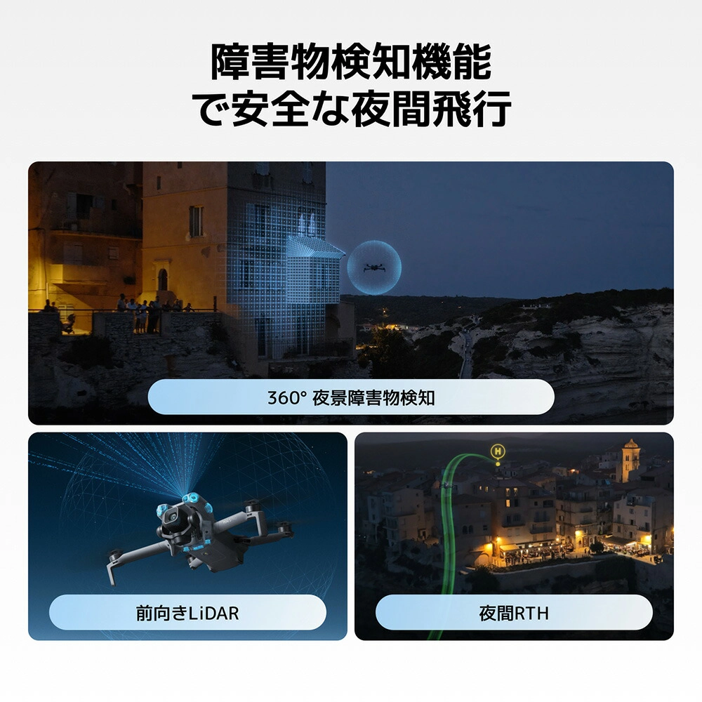 - 前向きLiDARと機体底部にある赤外線センサーで補完された全方向デュアルビジョンシステム