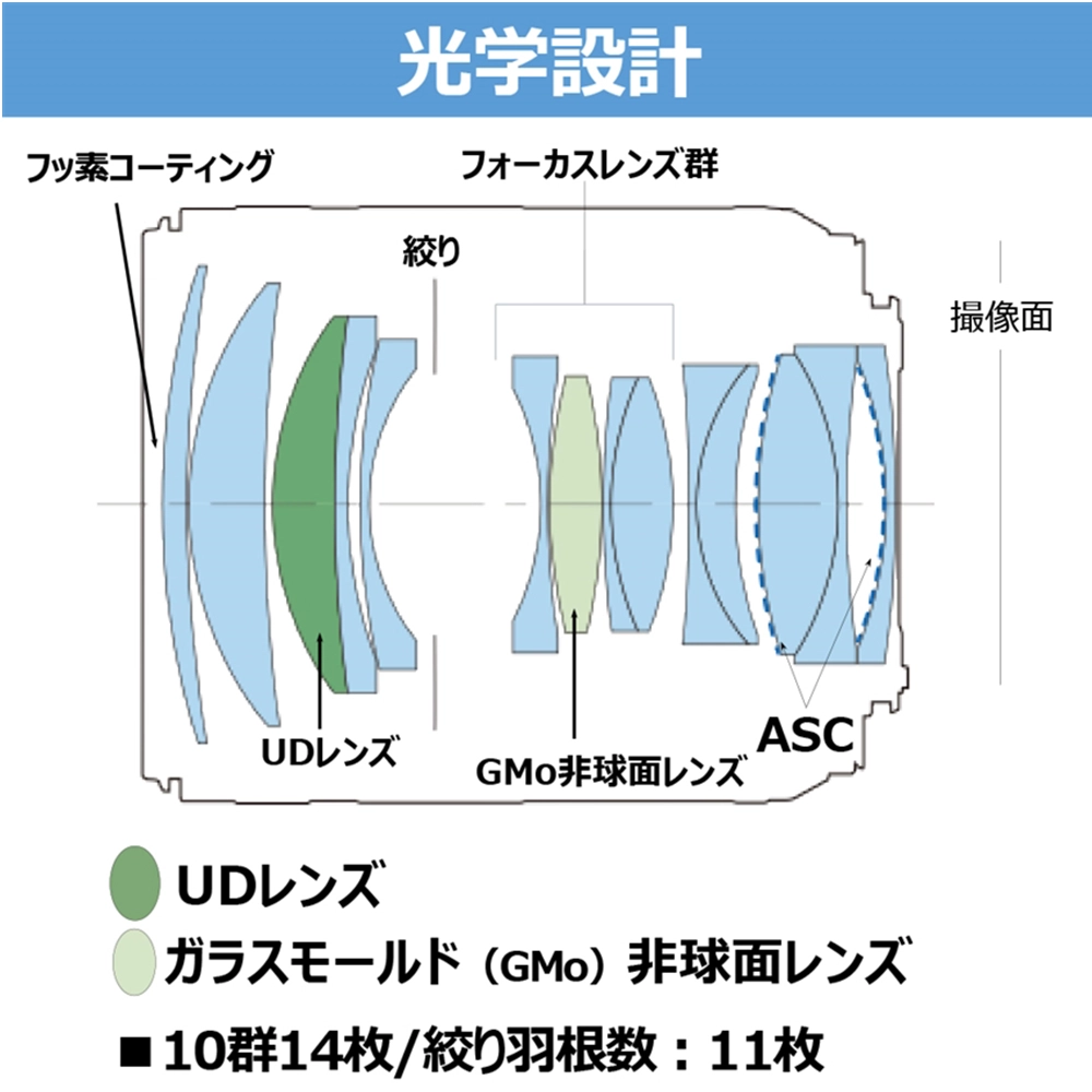 リアフォーカス方式を採用し、VCM(ボイスコイルモーター)により4枚構成のフォーカスレンズ群を駆動しています。質量の大きなレンズユニットを高速・高精度に駆動できるアクチュエータとフォーカスレンズ群4枚構成により、ブリージングの抑制と俊敏なAFの両立を実現しました。