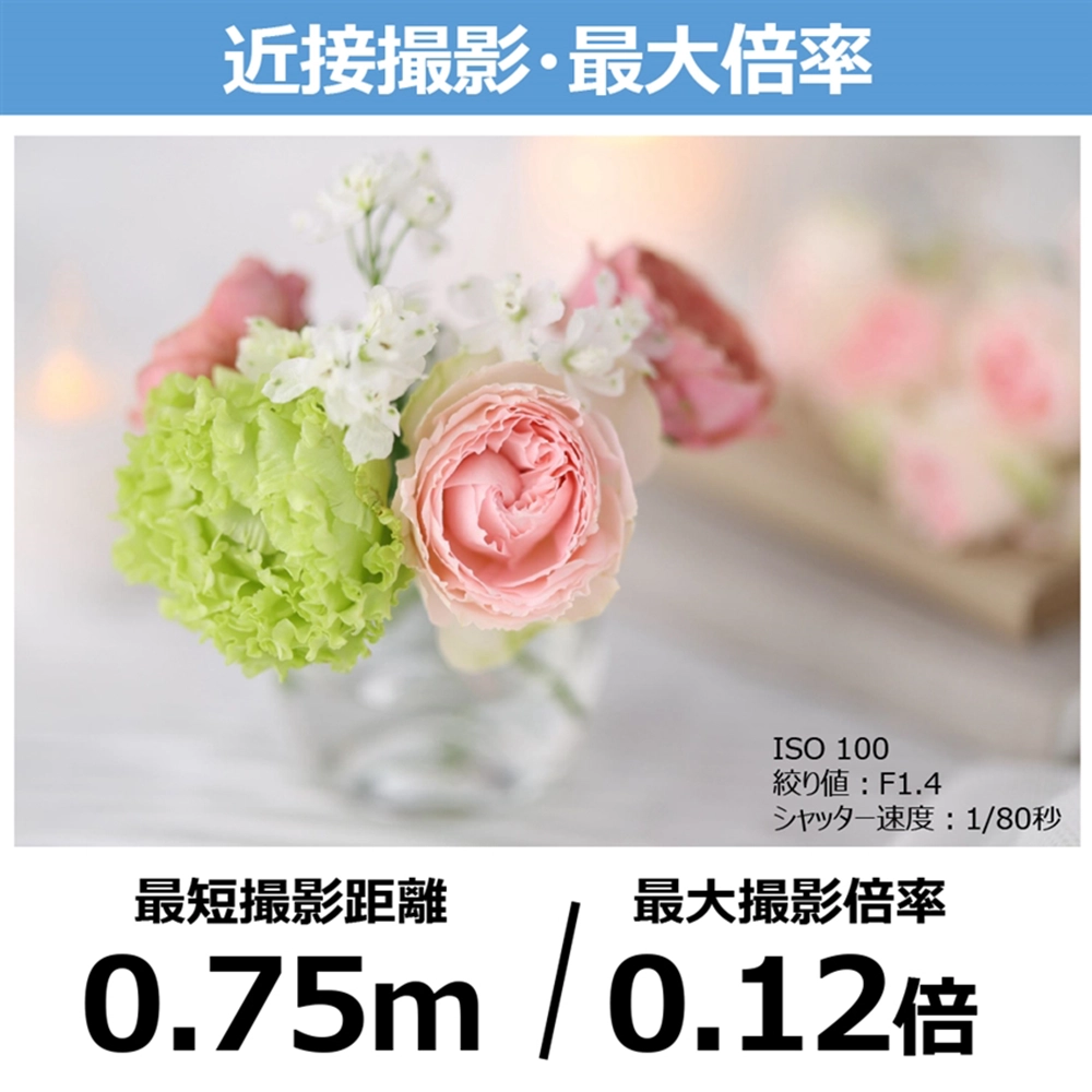 最短撮影距離0.75m/最大撮影倍率0.12倍の近接撮影が行えます。(EF85mm F1.4L IS USMの最短撮影距離は0.85m ※当社比較)