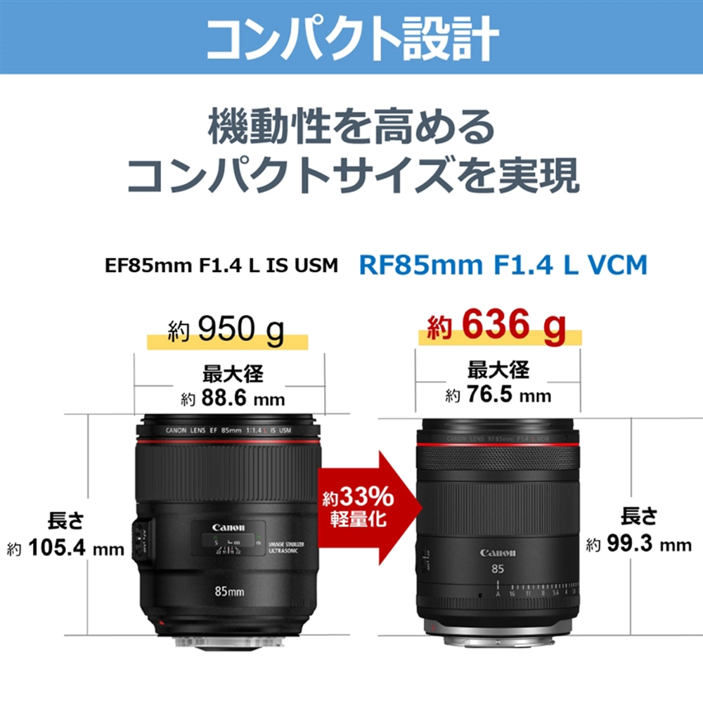 大口径中望遠レンズでありながら最大径76.5mmのスリムなコンパクトサイズ。収納性の高さや持ち歩きのしやすさにつながり、撮影時も周囲や被写体に圧迫感を与えません。また、EF85mm F1.4L IS USMから大幅な軽量化により、機動性の向上を実現しました。